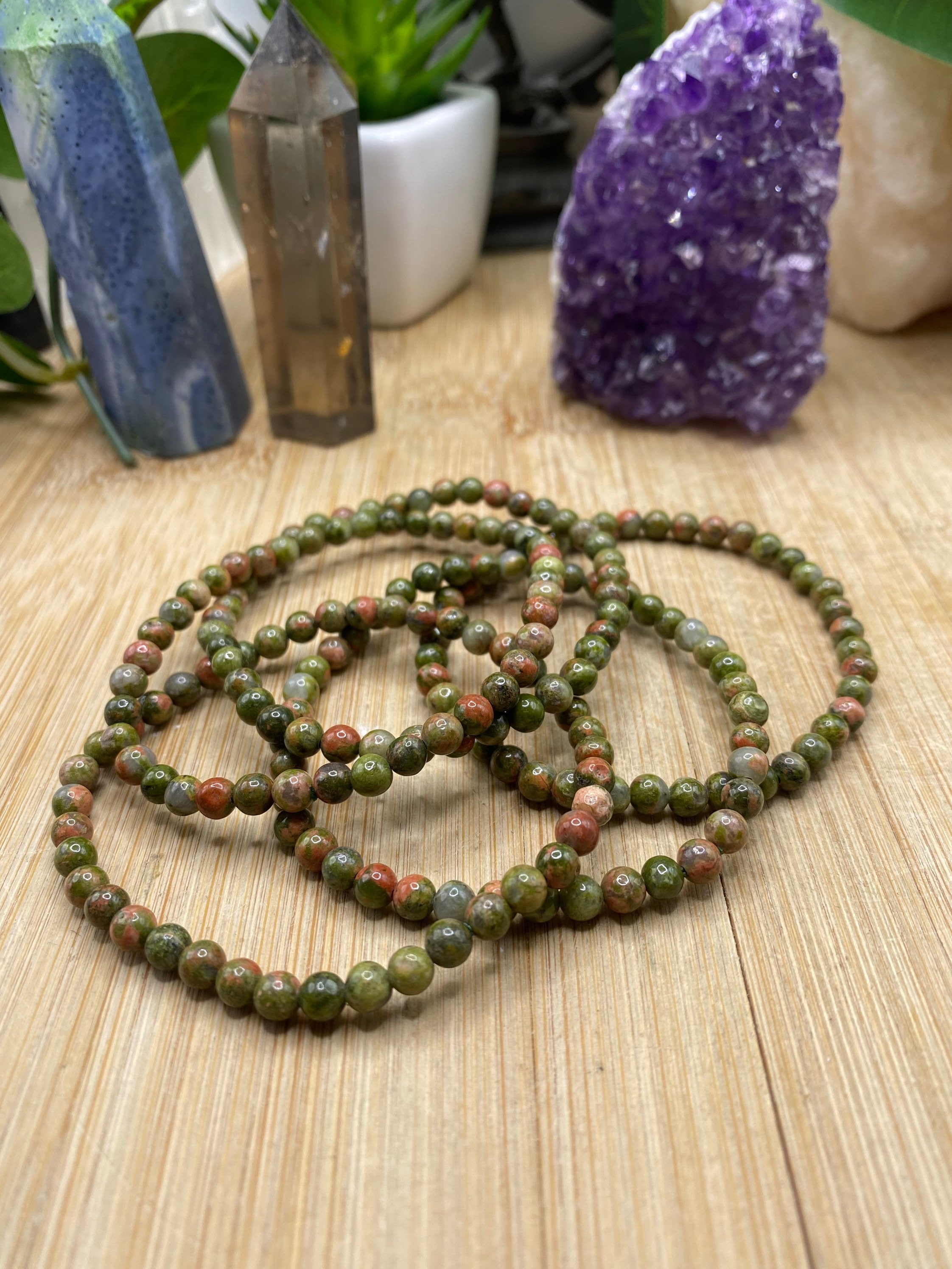 This beautiful bead bracelet is made of unakite. The beads are 4mm. The bracelet is elastic and fits most wrists.