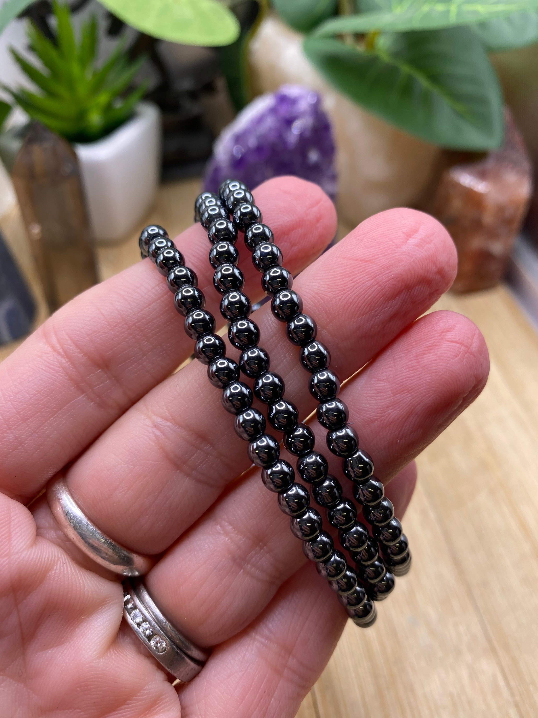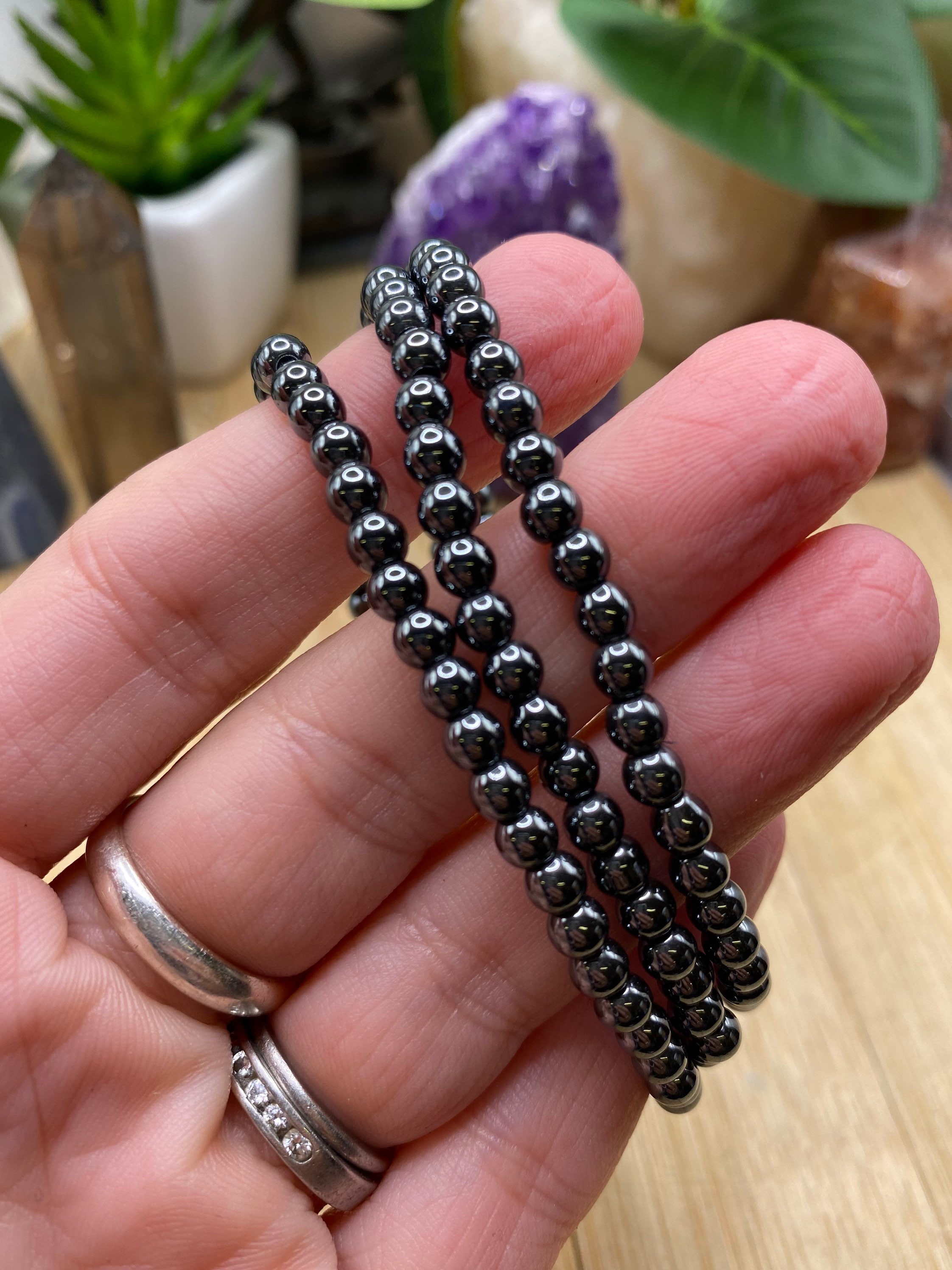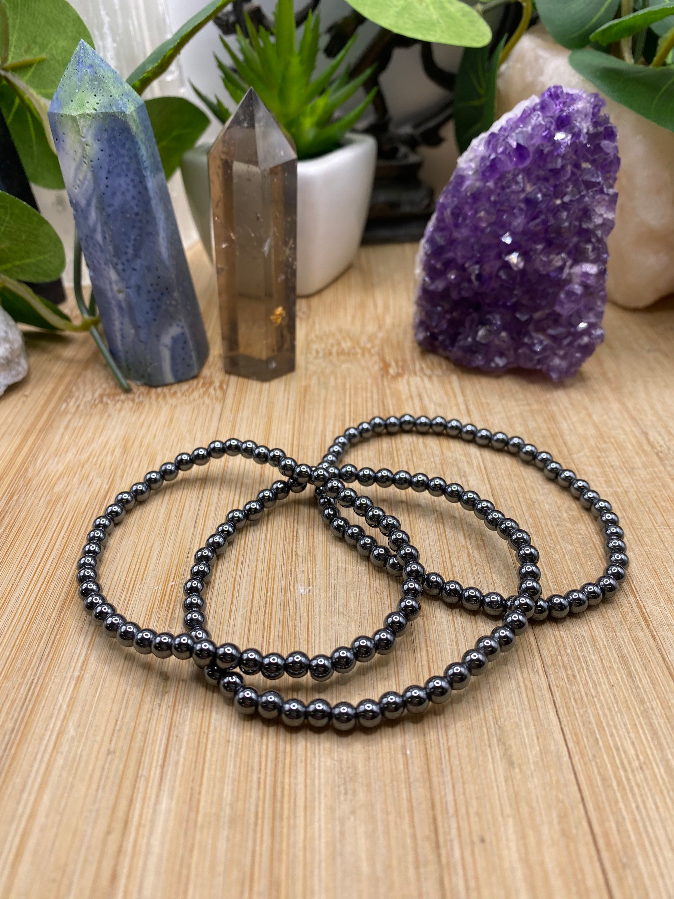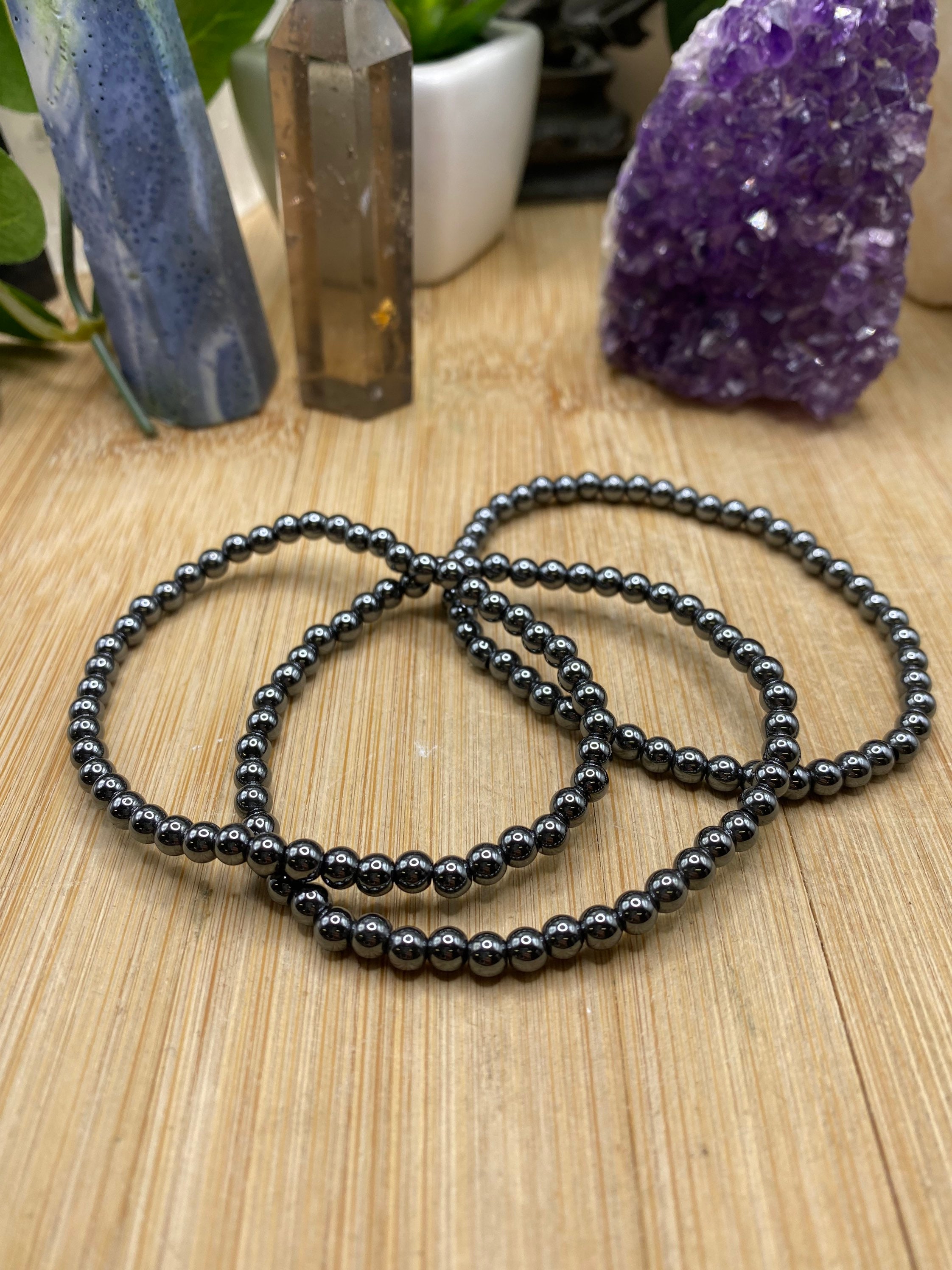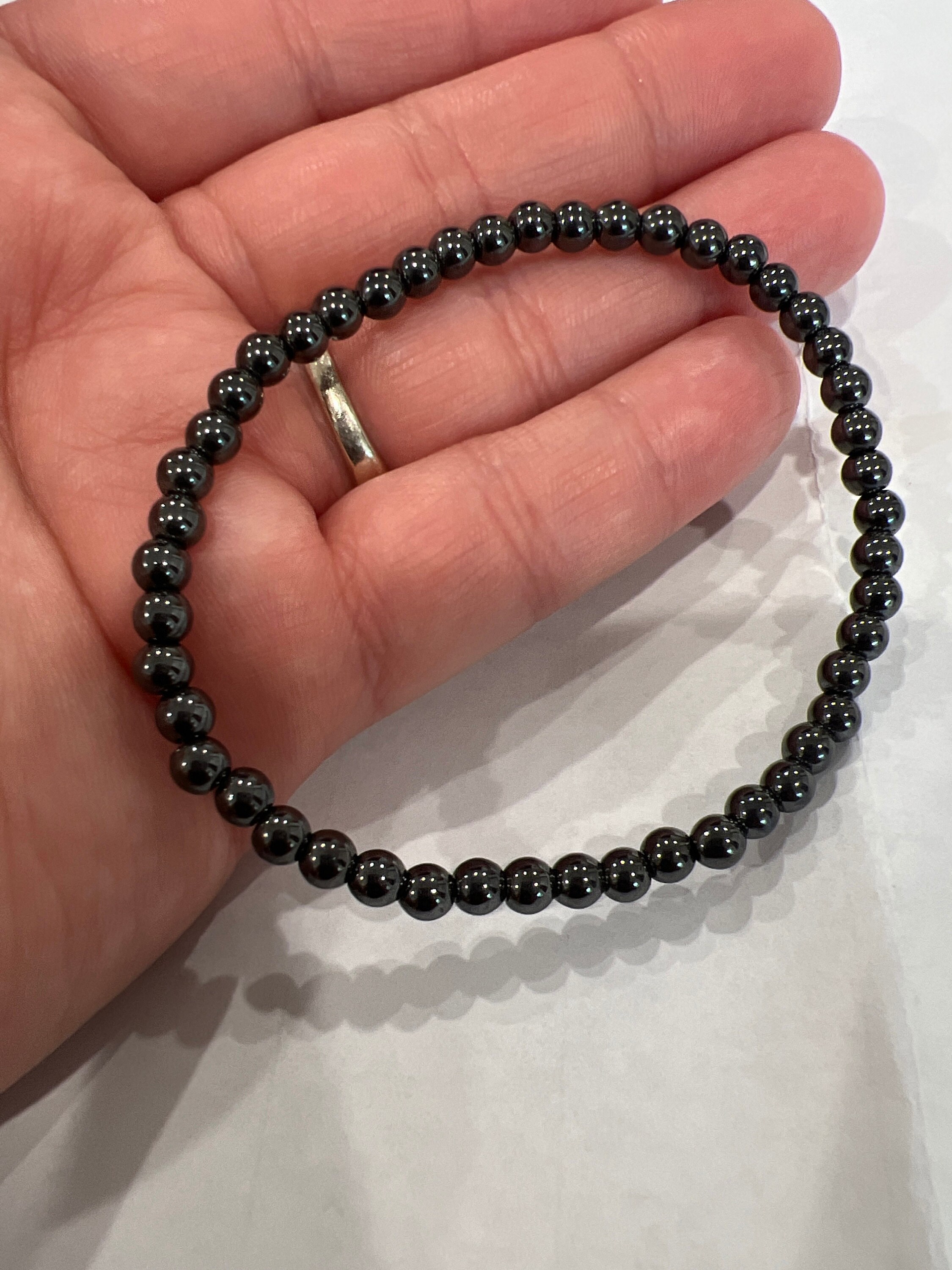 This beautiful bead bracelet is made of hematite. The beads are 4mm. The bracelet is elastic and fits most wrists.