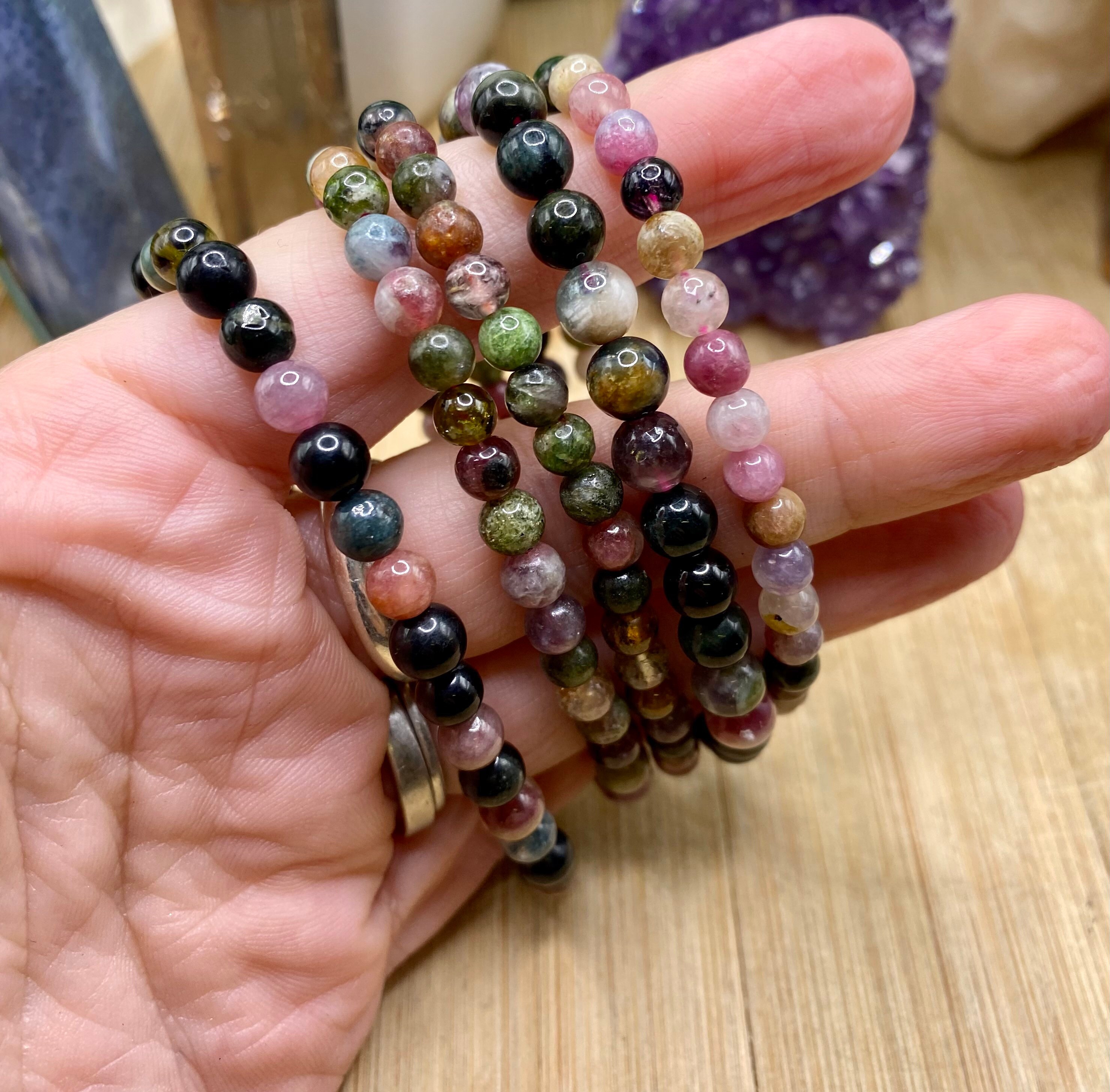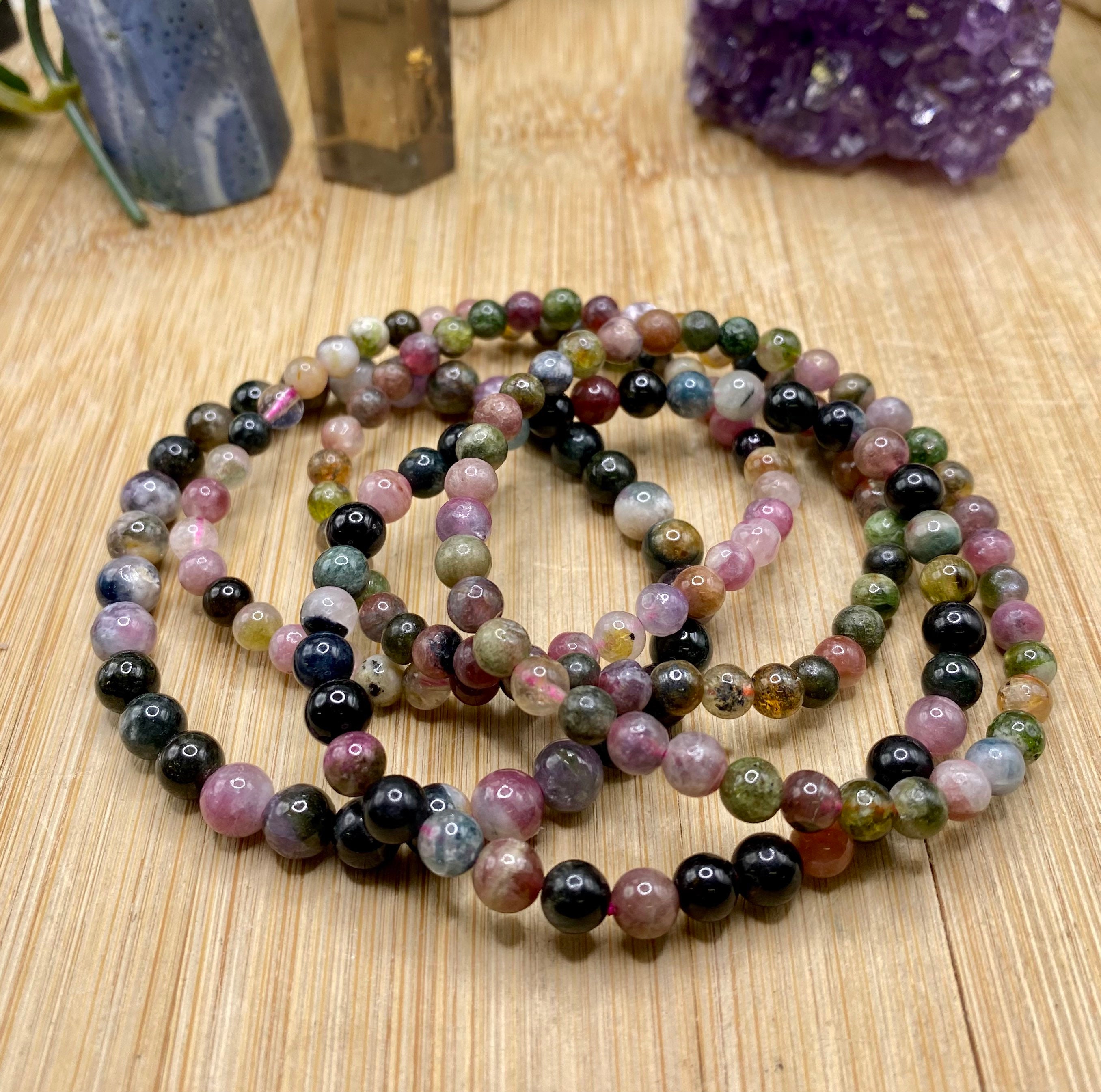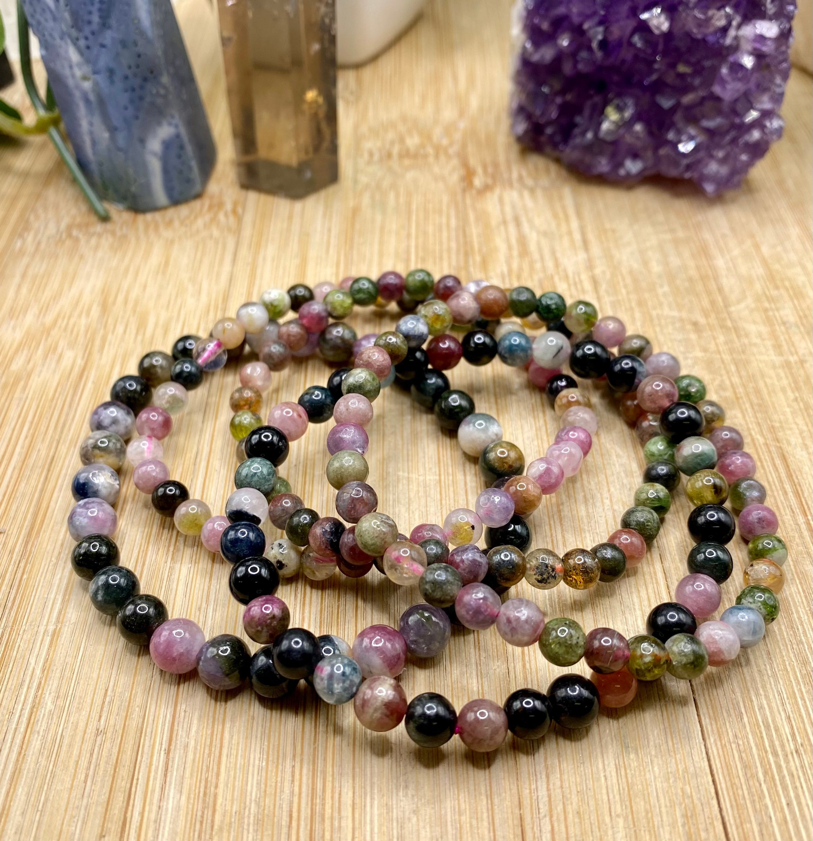This beautiful bead bracelet is made of black, pink and green tourmaline beads. The beads are 4-6 mm. The bracelet is elastic and fits most wrists.