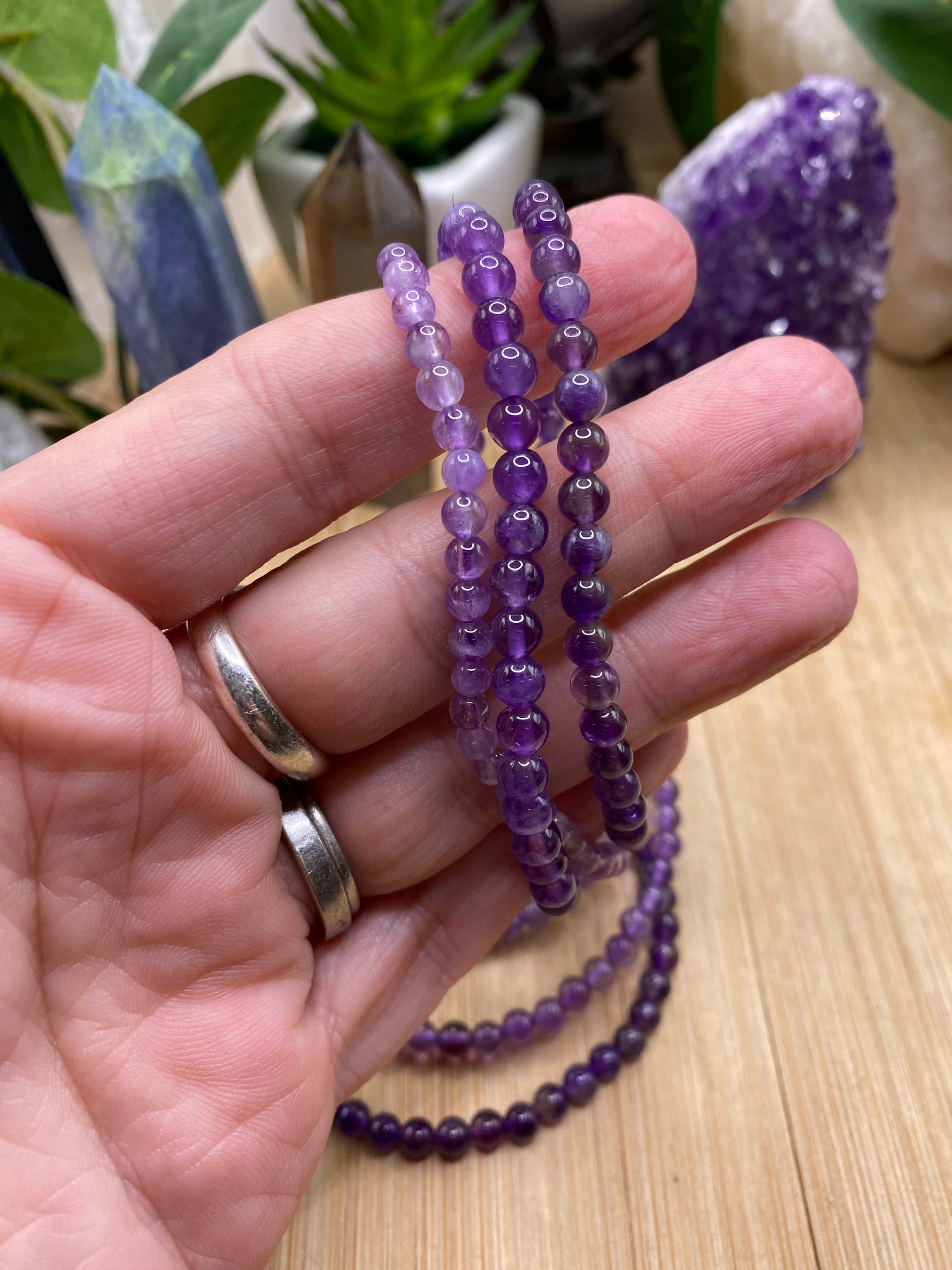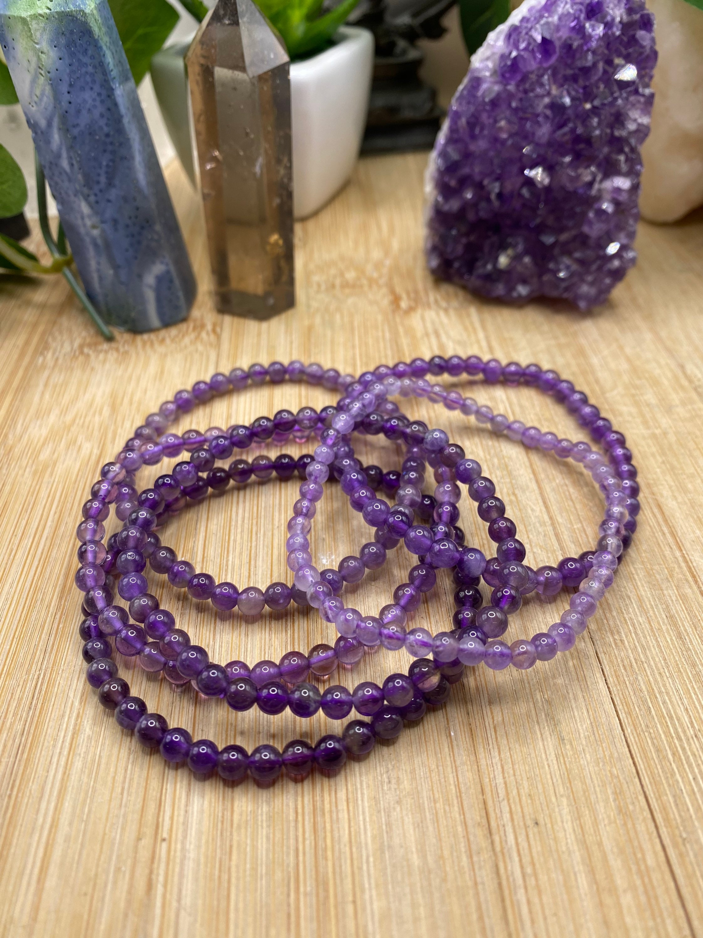 These bracelets are gorgeous deep purple. They are elastic and fit most wrists. They have 4mm beads.