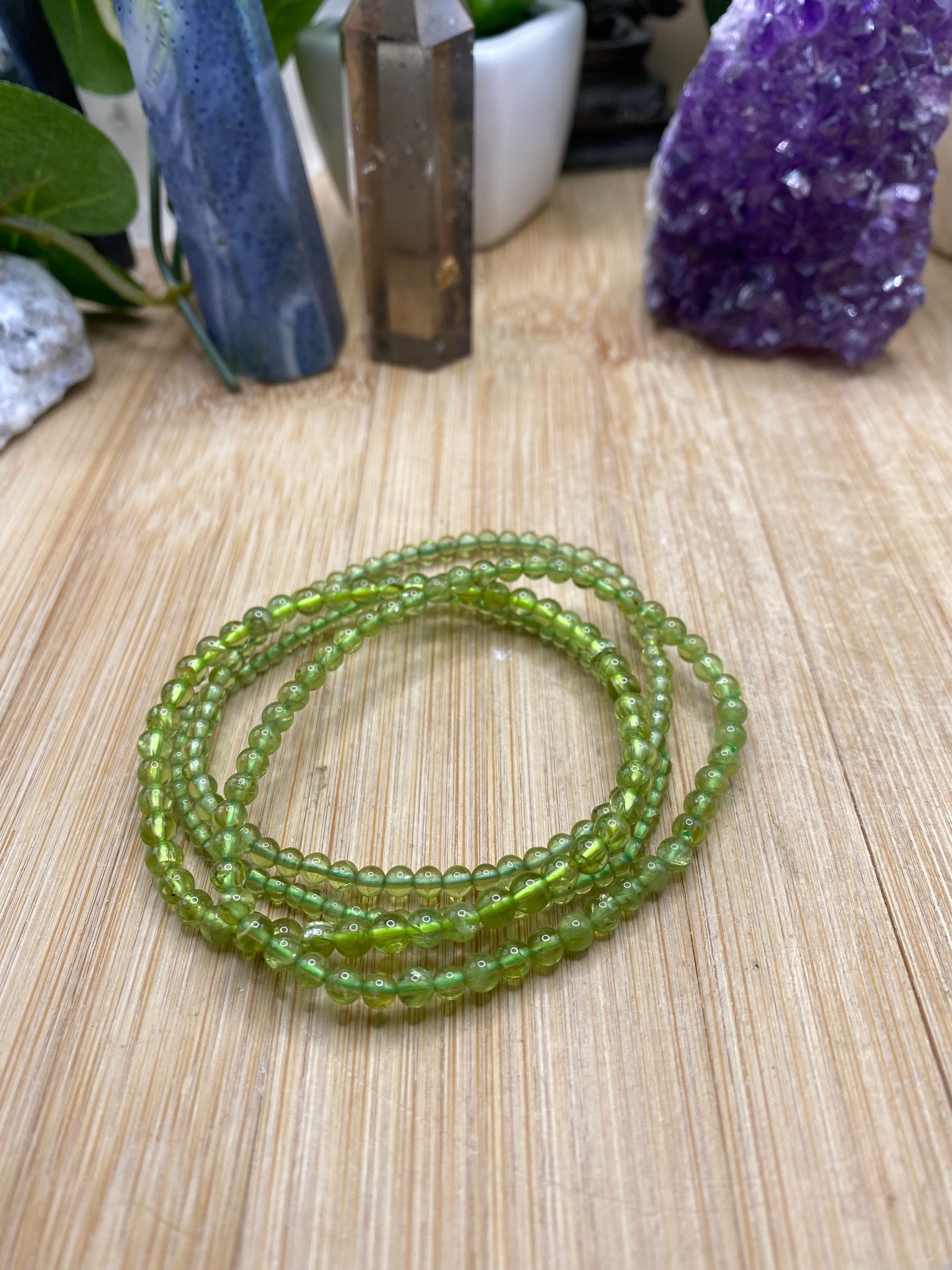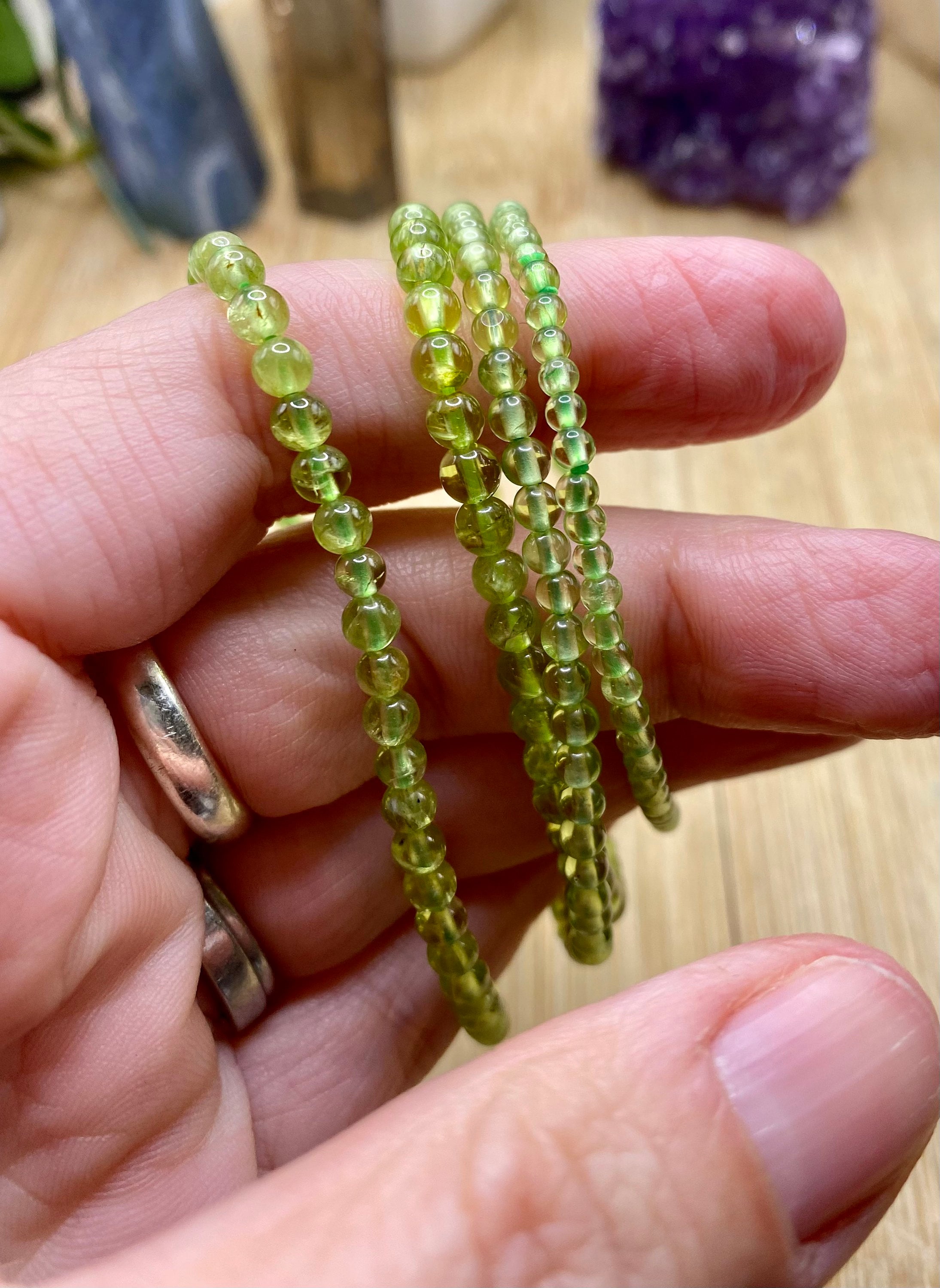 These peridot bracelets are gorgeous bright green. They are elastic and fit most wrists. They have 4mm beads.