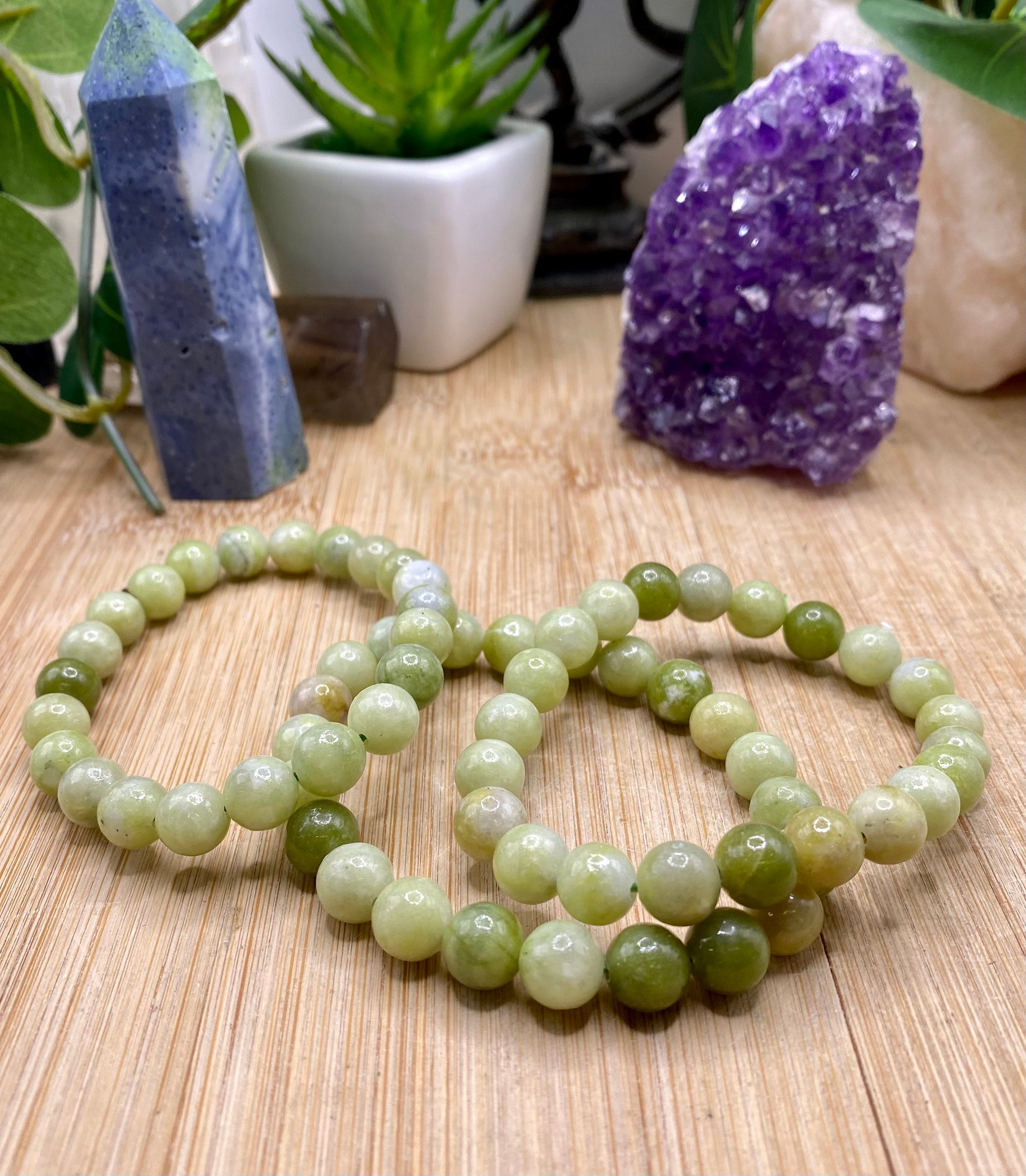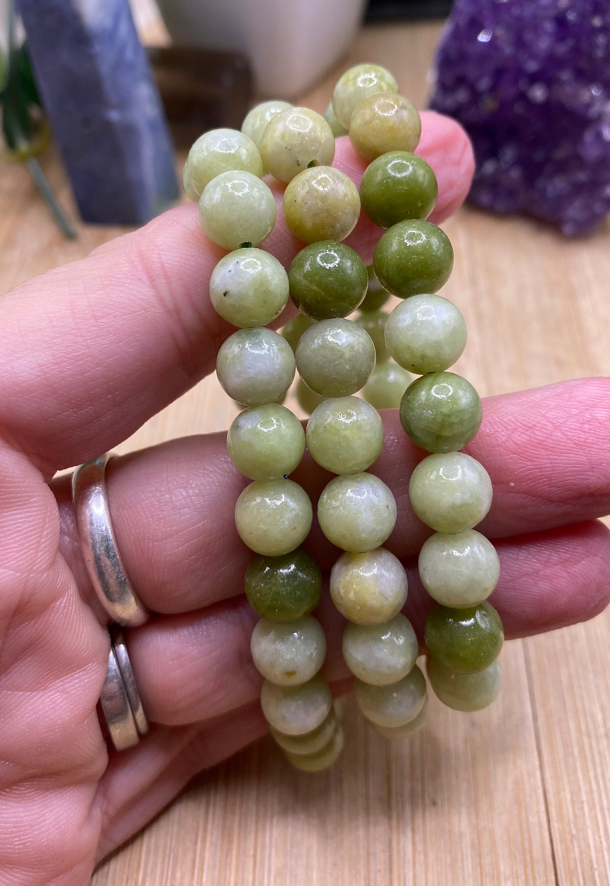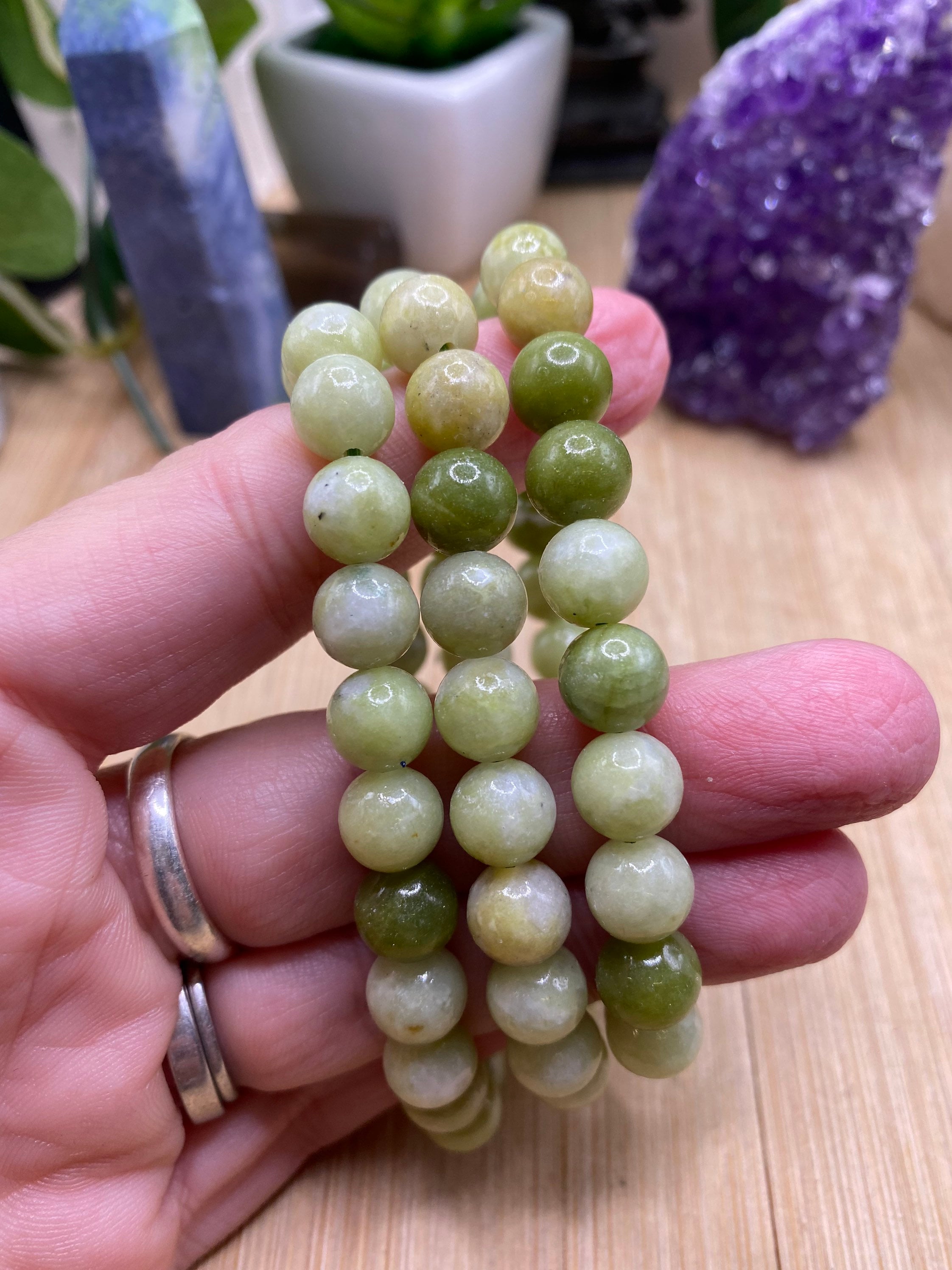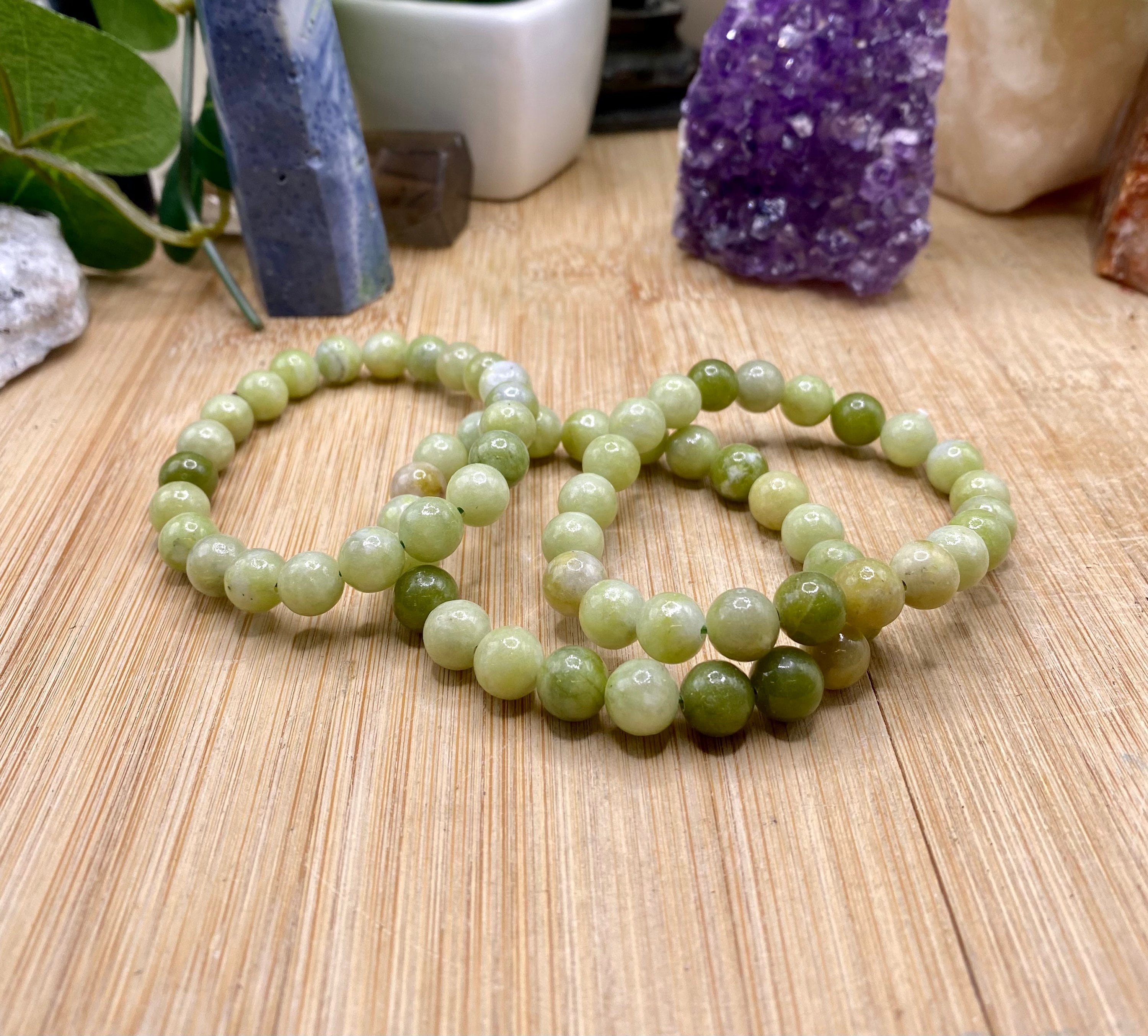 This beautiful bead bracelet is made of jade. The beads are 8mm. The bracelet is elastic and fits most wrists.