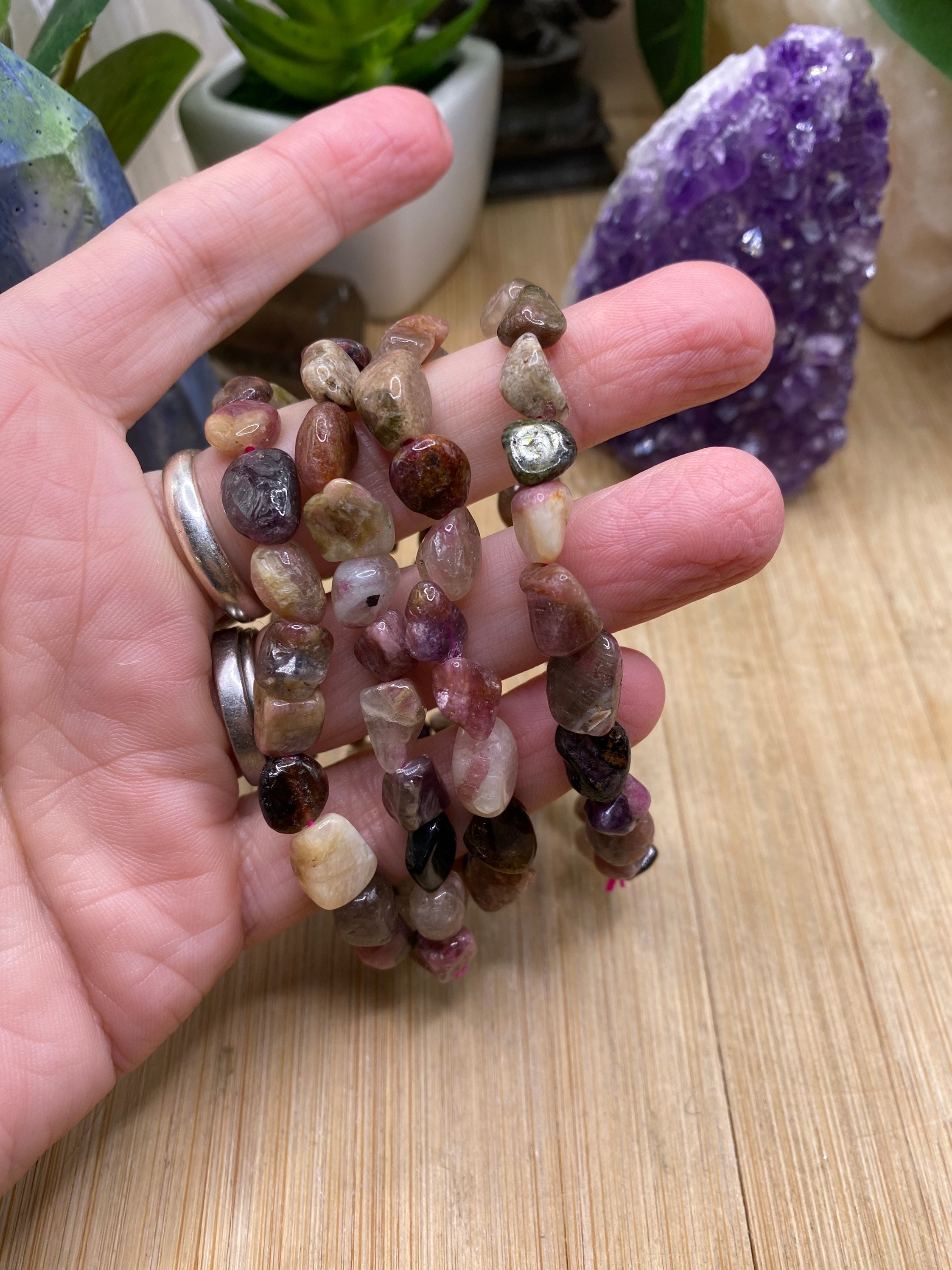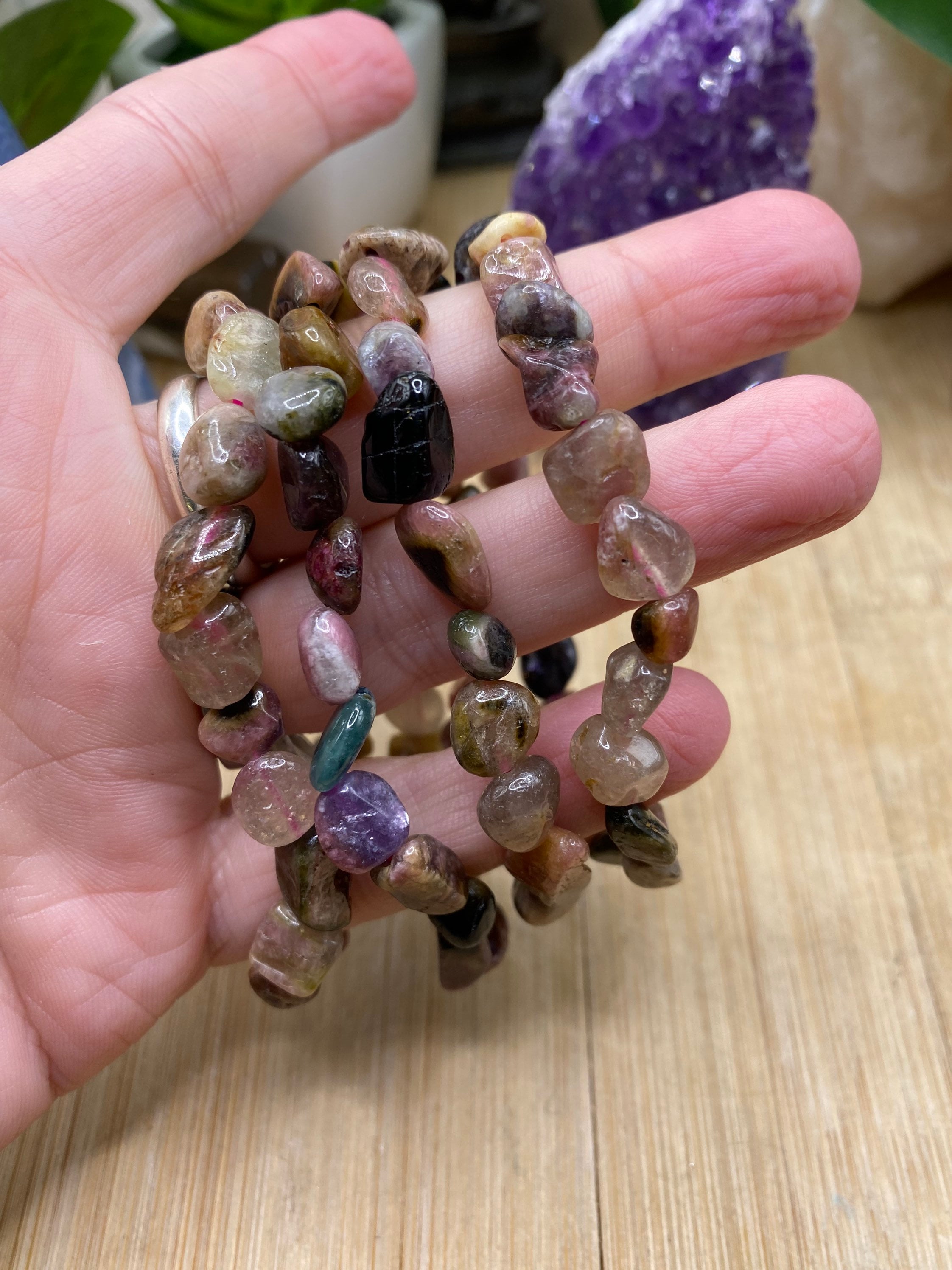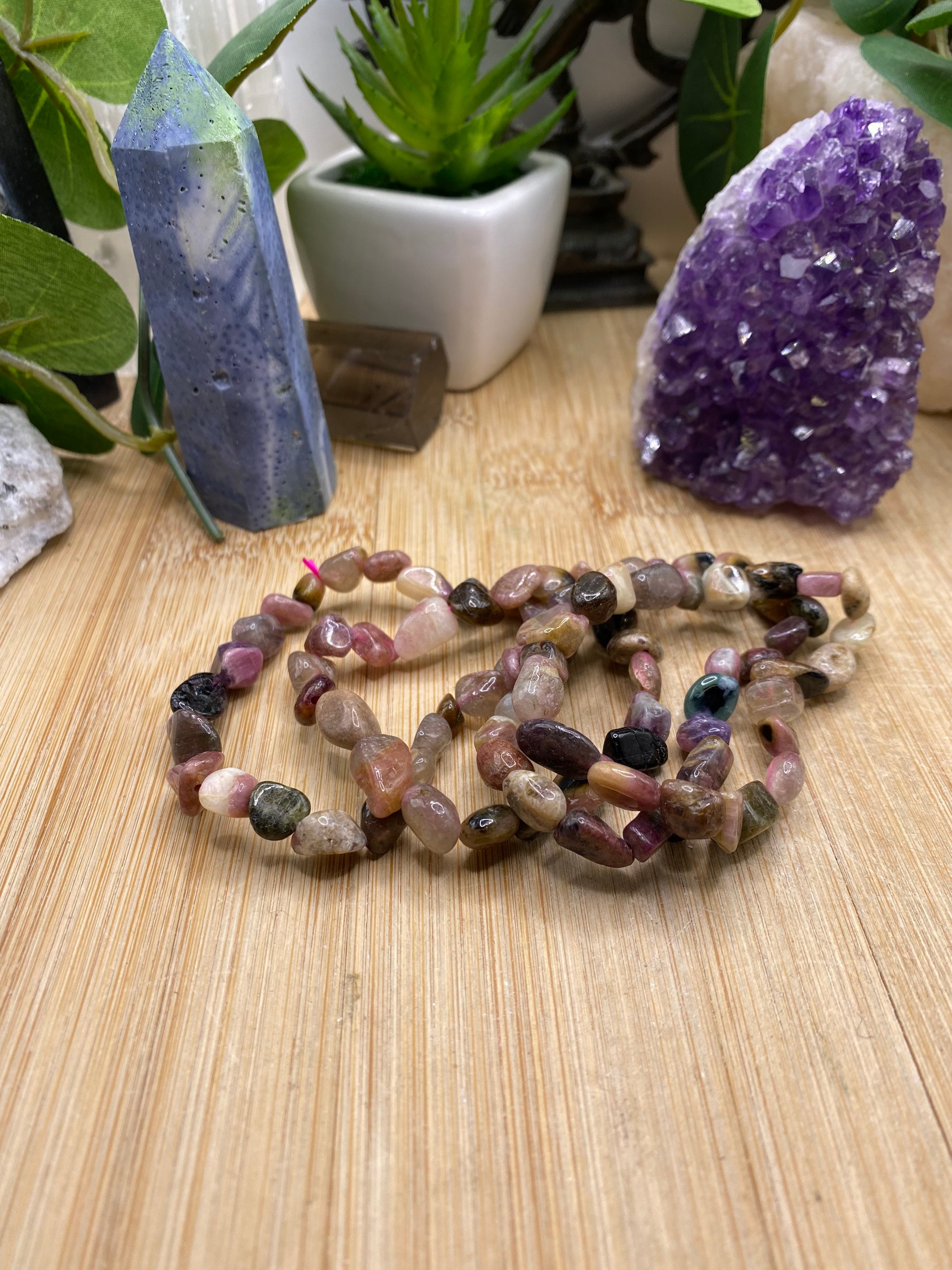 This beautiful bead bracelet is made of black, pink and green tourmaline beads. The beads are 8-10 mm. The bracelet is elastic and fits most wrists.