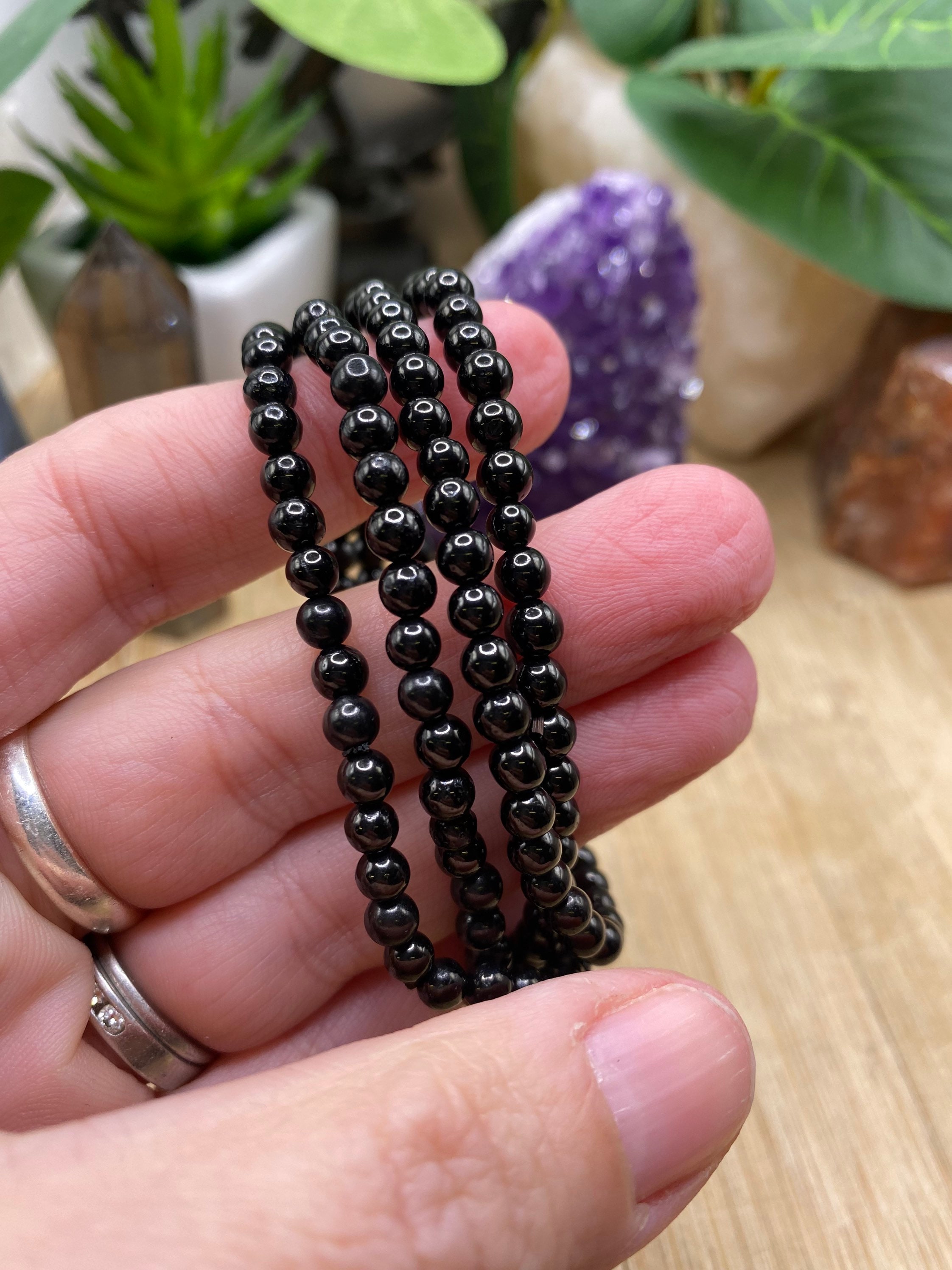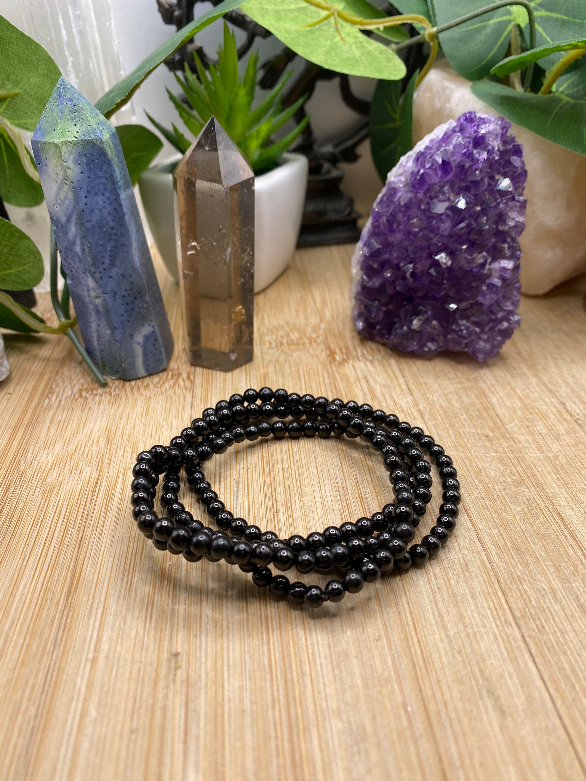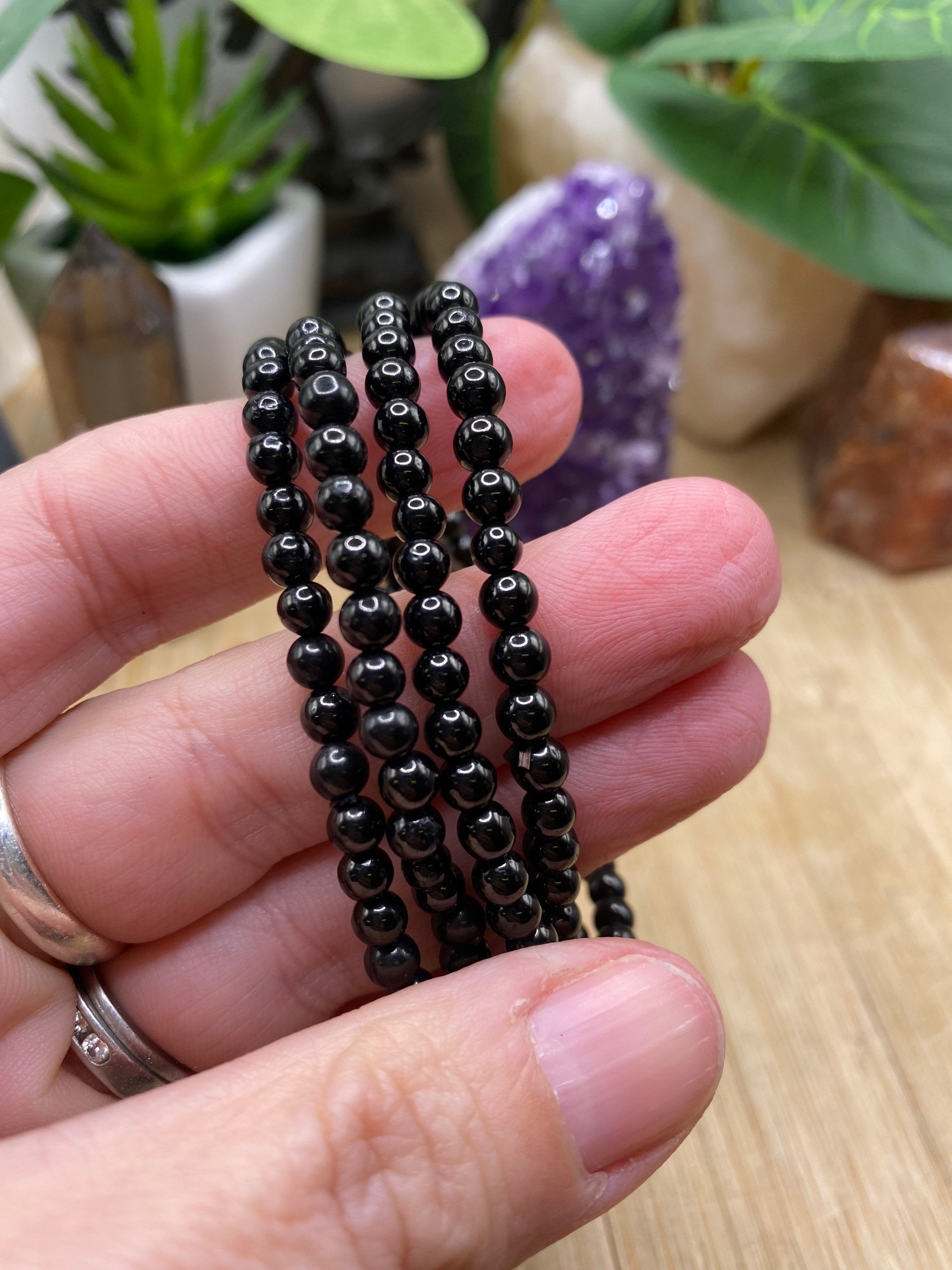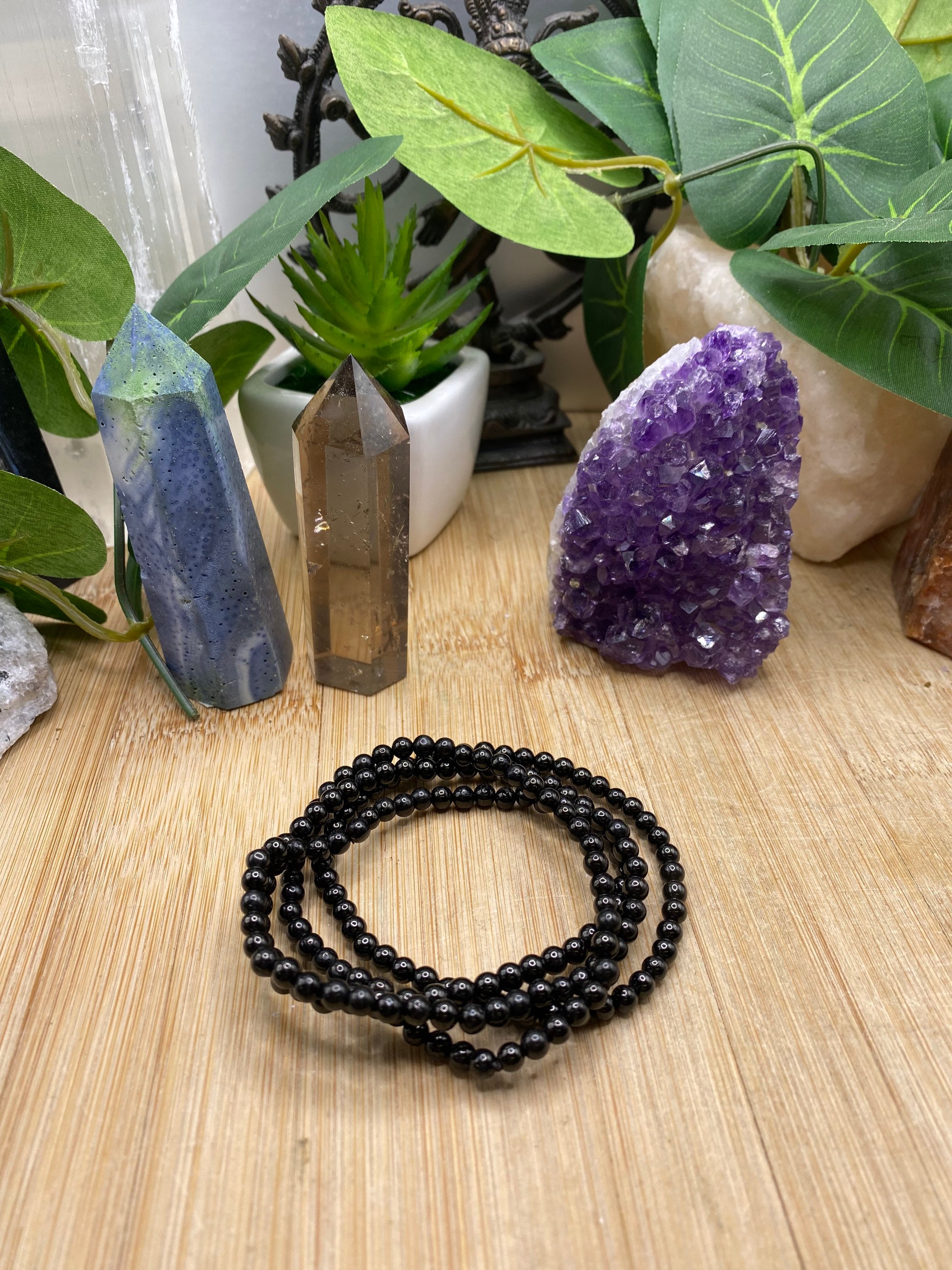 This beautiful bead bracelet is made of jet. The beads are 4mm. The bracelet is elastic and fits most wrists.