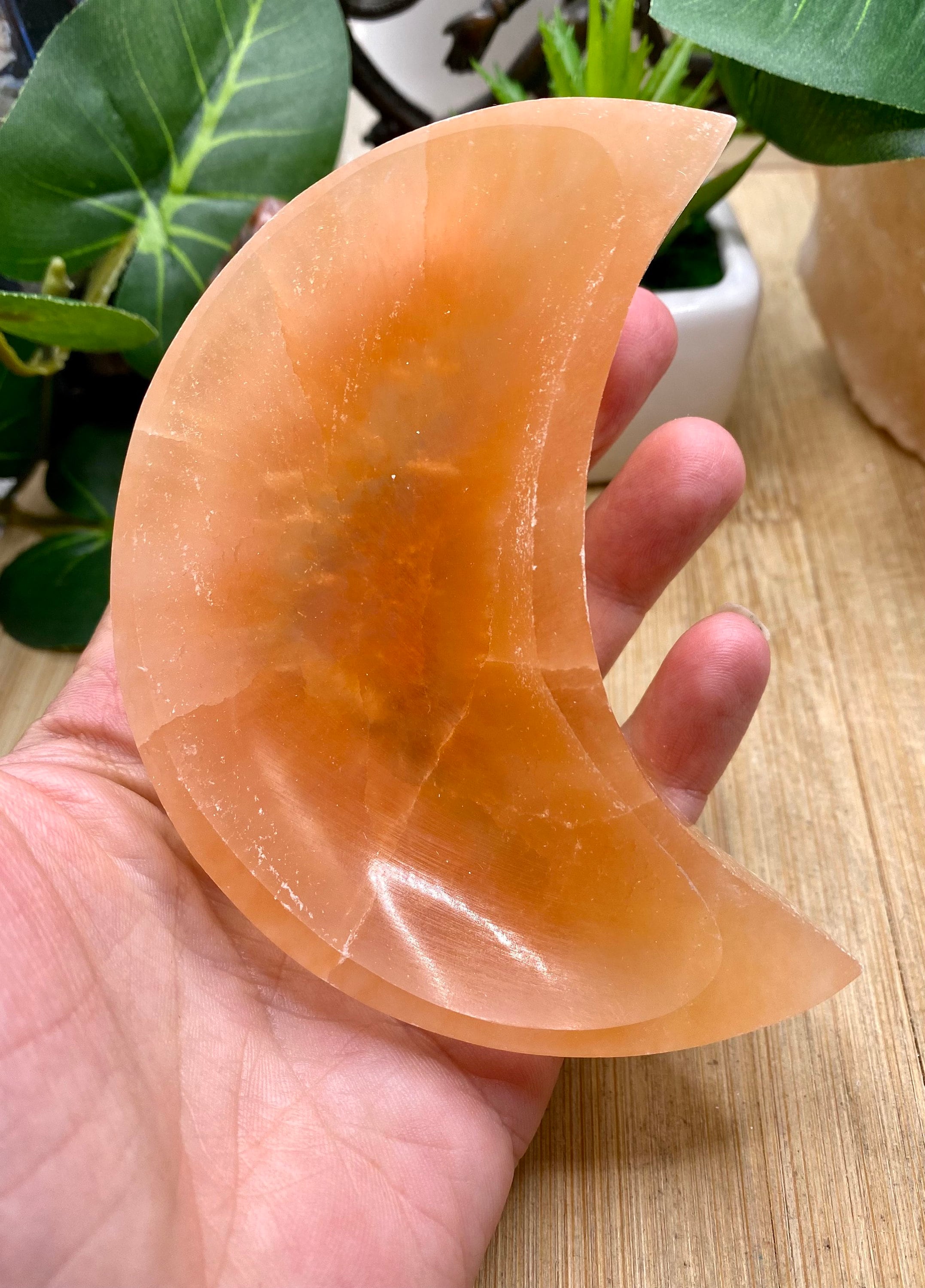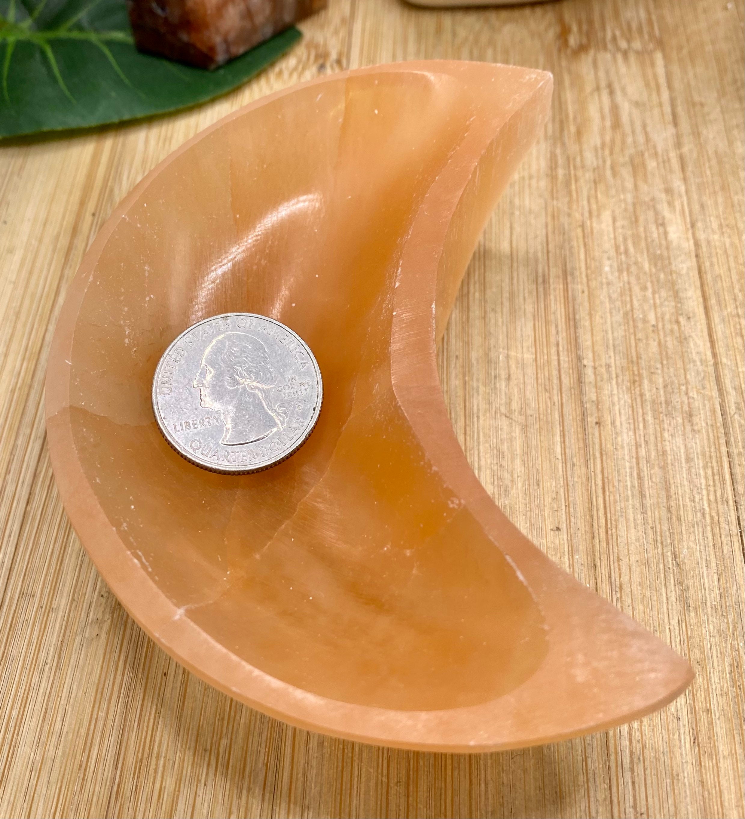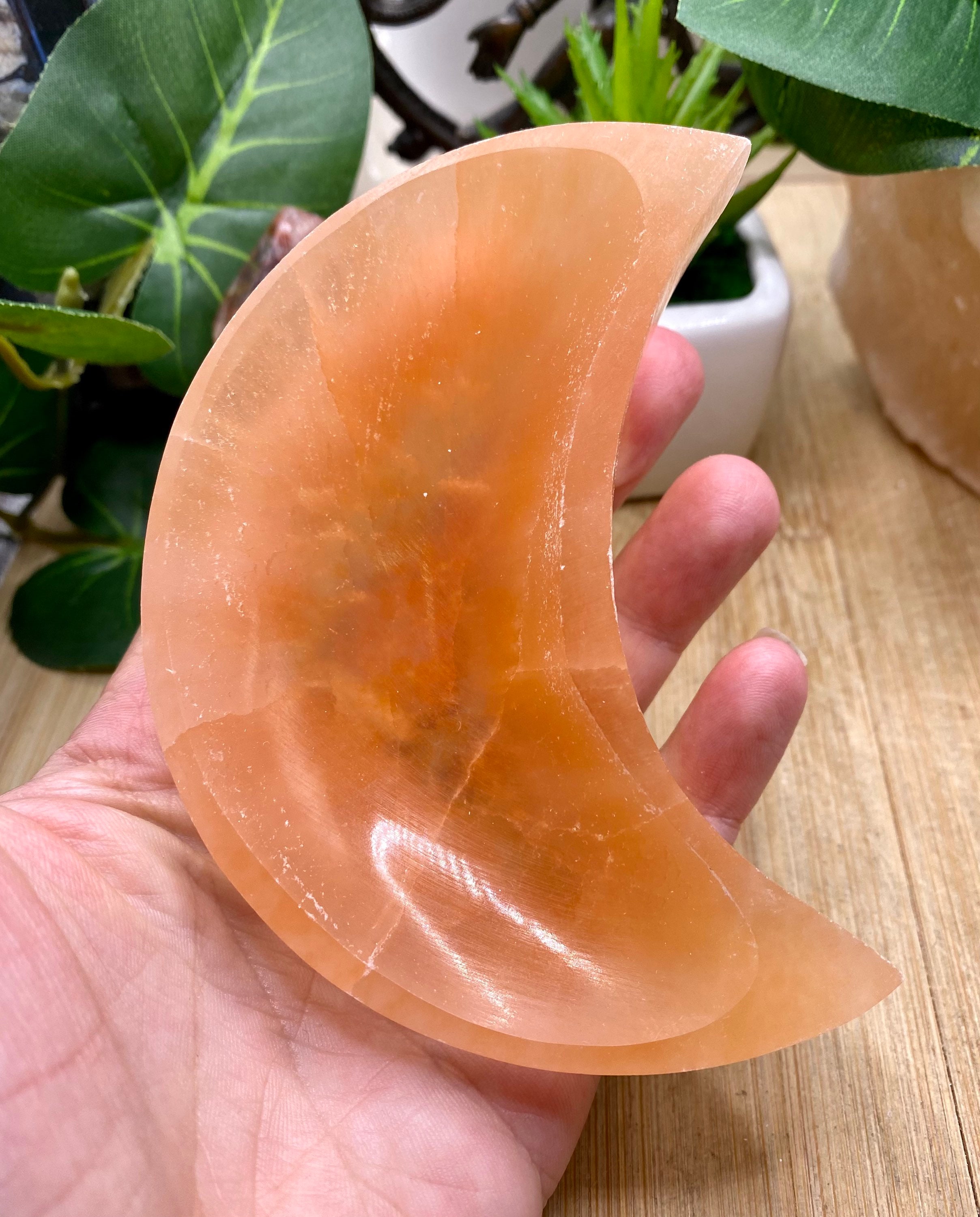 These Polished orange selenite moon bowls would make make great ritual/offering bowls or altar bowls. They are also great for cleansing crystals or tarot cards. They are approximately 3.5 inches by approximately 3 Inches in size. These are natural crystal and handcrafted so sizes may vary a little. You will receive a polished selenite bowl similar to the one shown.