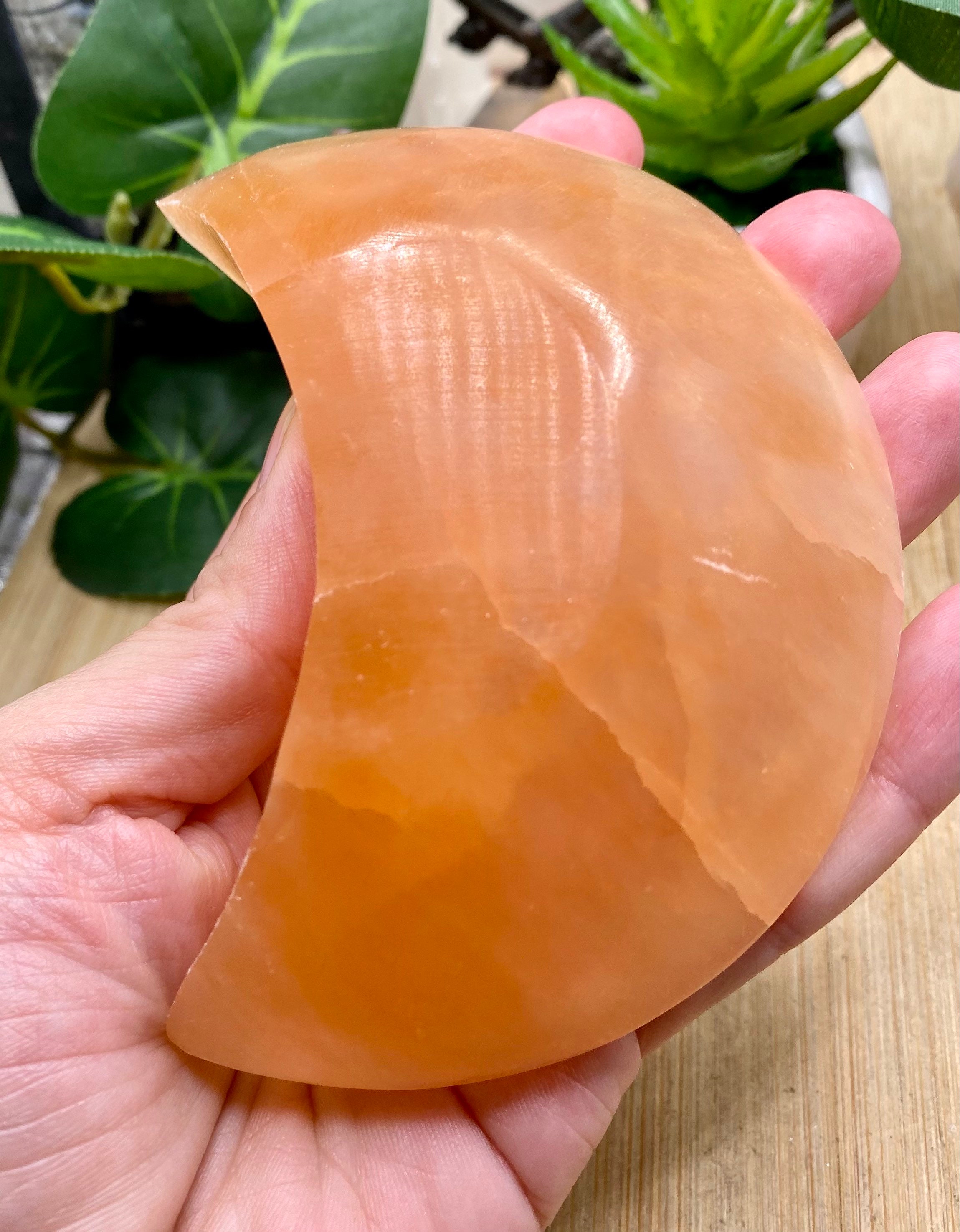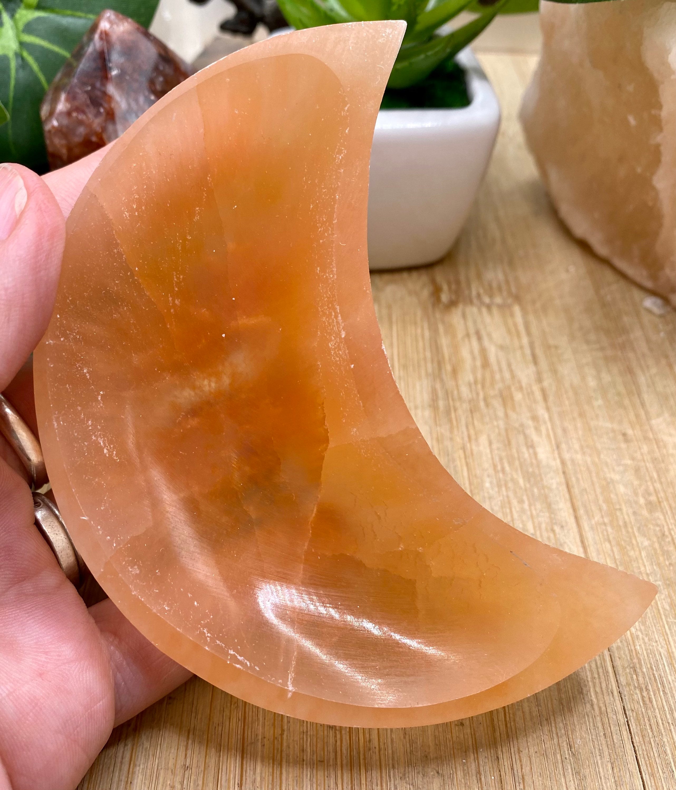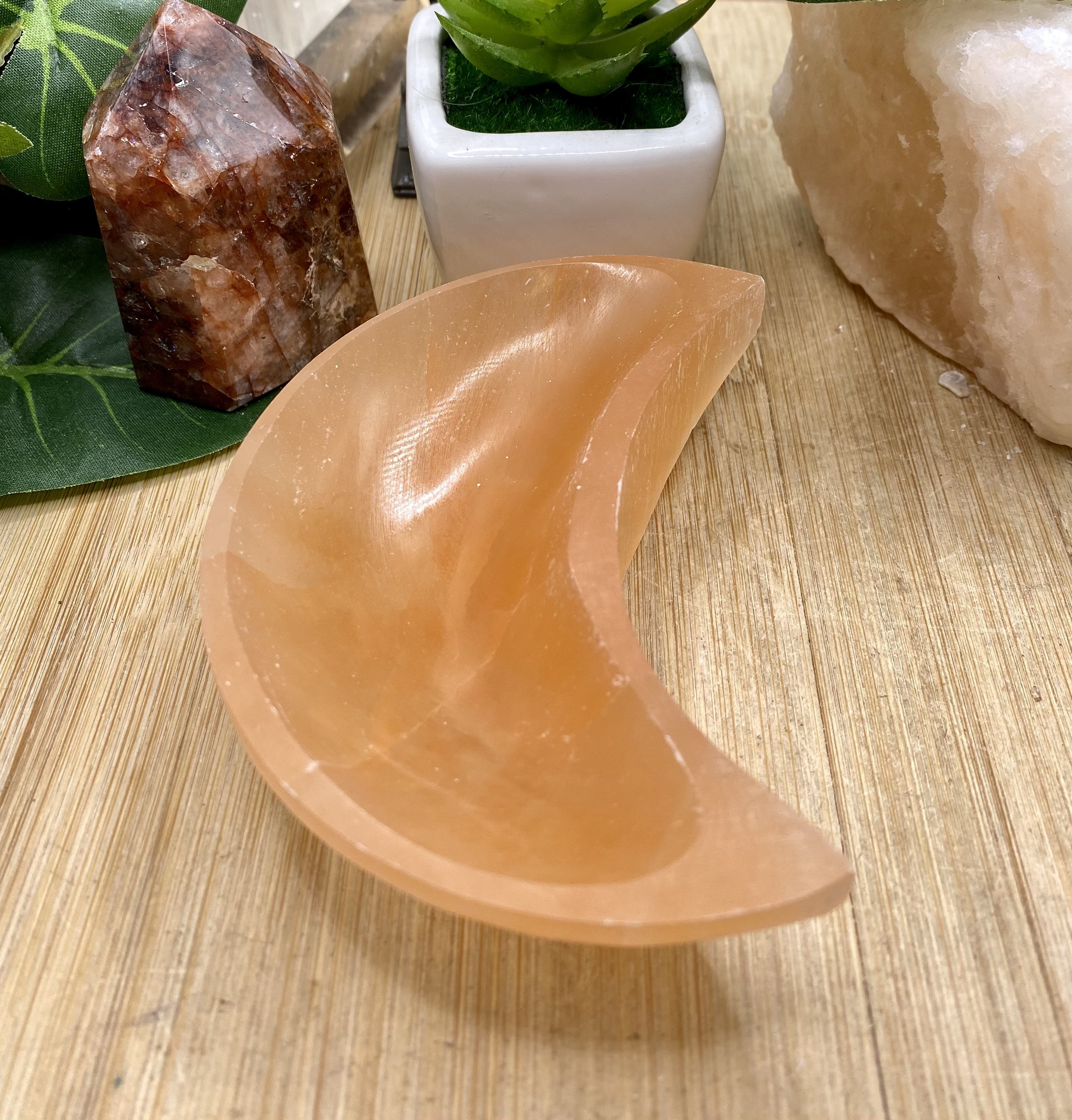 These Polished orange selenite moon bowls would make make great ritual/offering bowls or altar bowls. They are also great for cleansing crystals or tarot cards. They are approximately 3.5 inches by approximately 3 Inches in size. These are natural crystal and handcrafted so sizes may vary a little. You will receive a polished selenite bowl similar to the one shown.