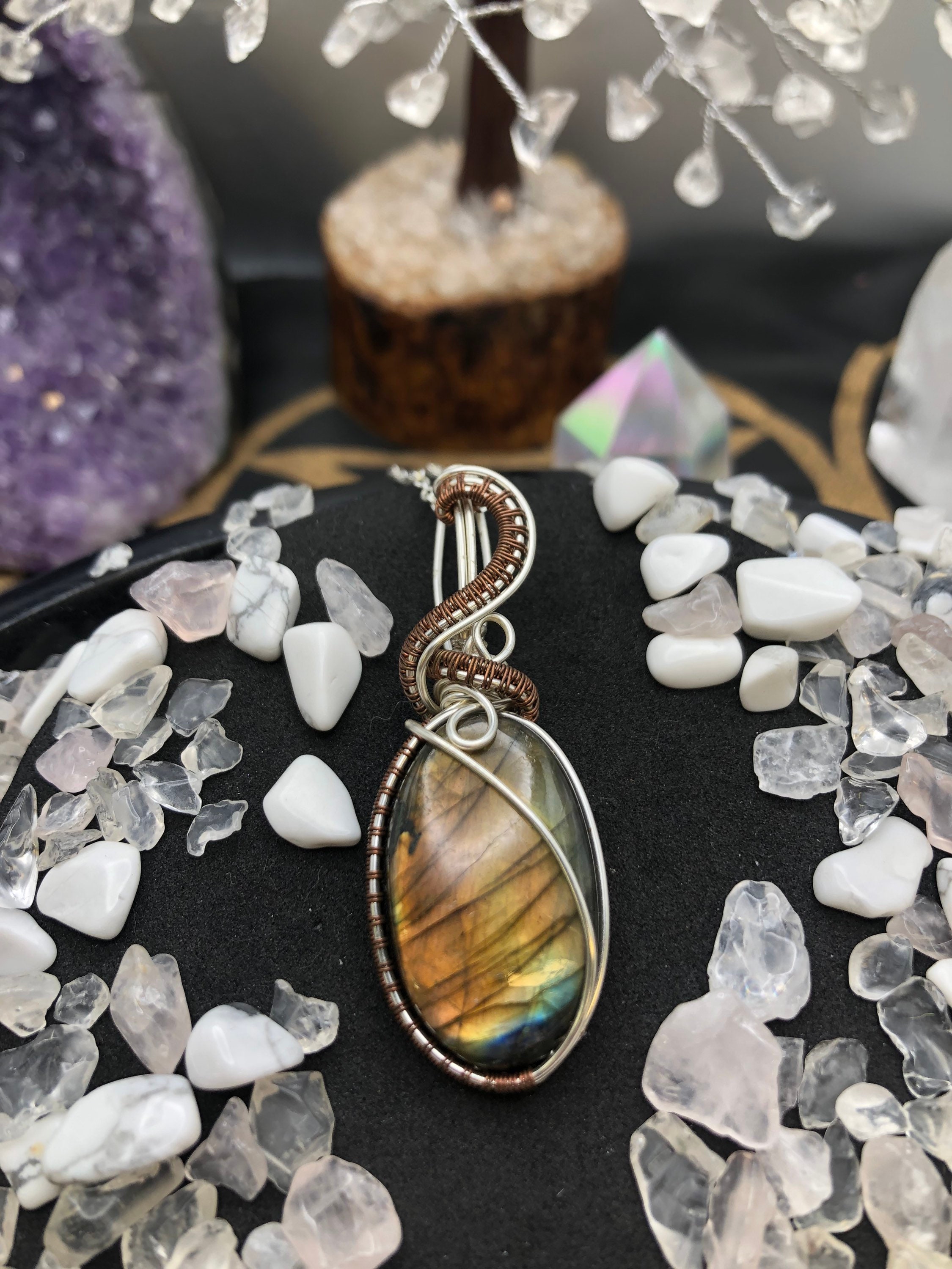 Labradorite Wire Wrapped Pendant Labradorite is the stone of magic. Self discovery. It activates the inner eye and assists in one moving between realities. Uncovers unconscious and subconscious belief patterns.