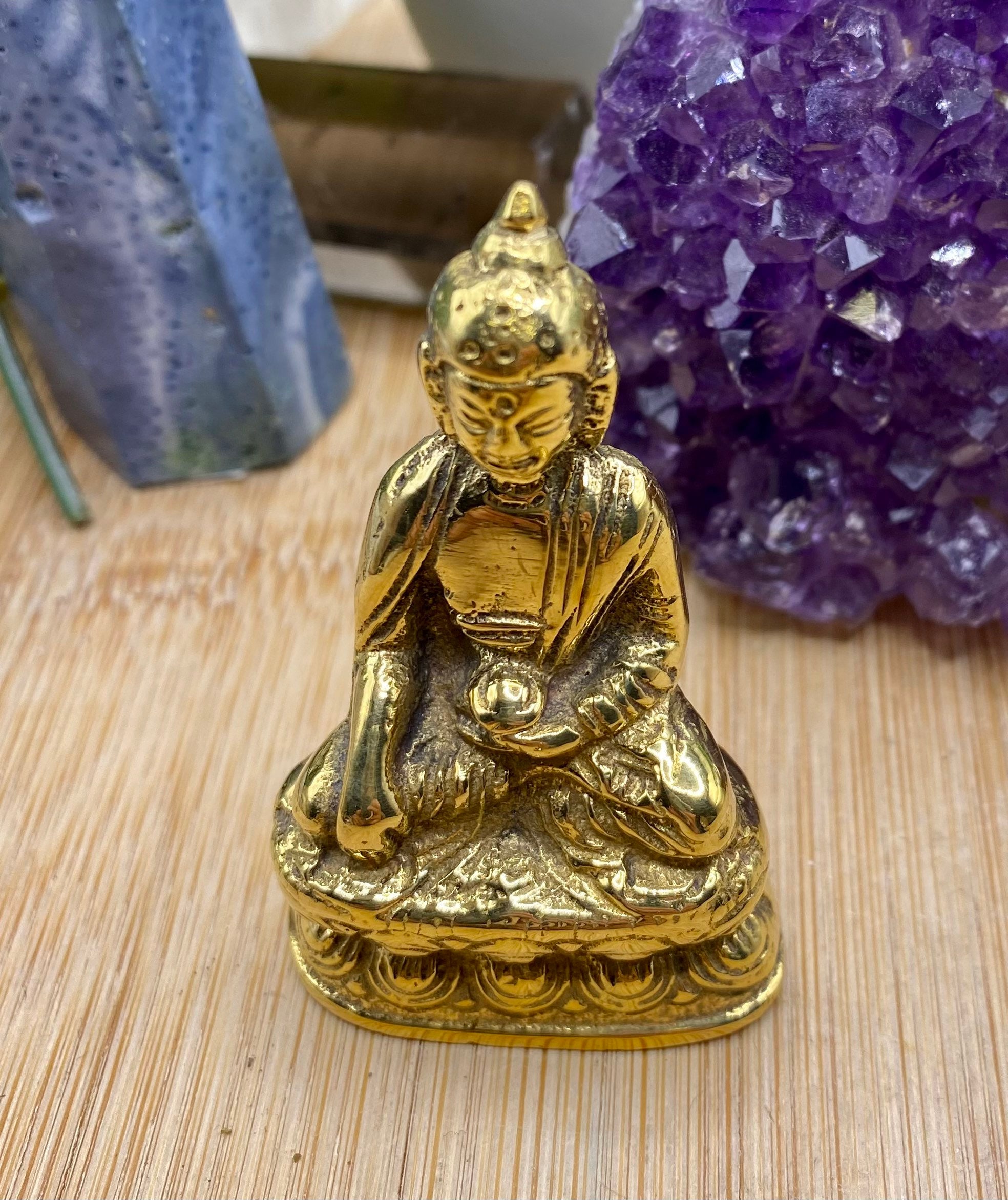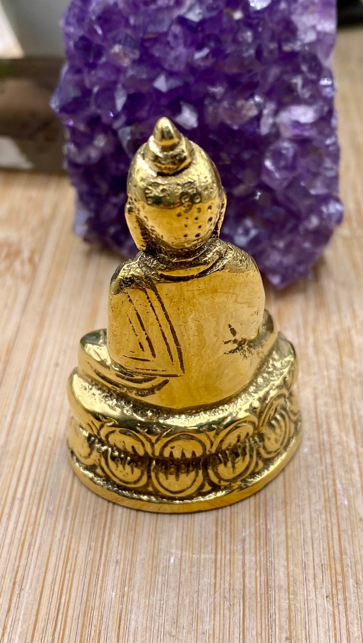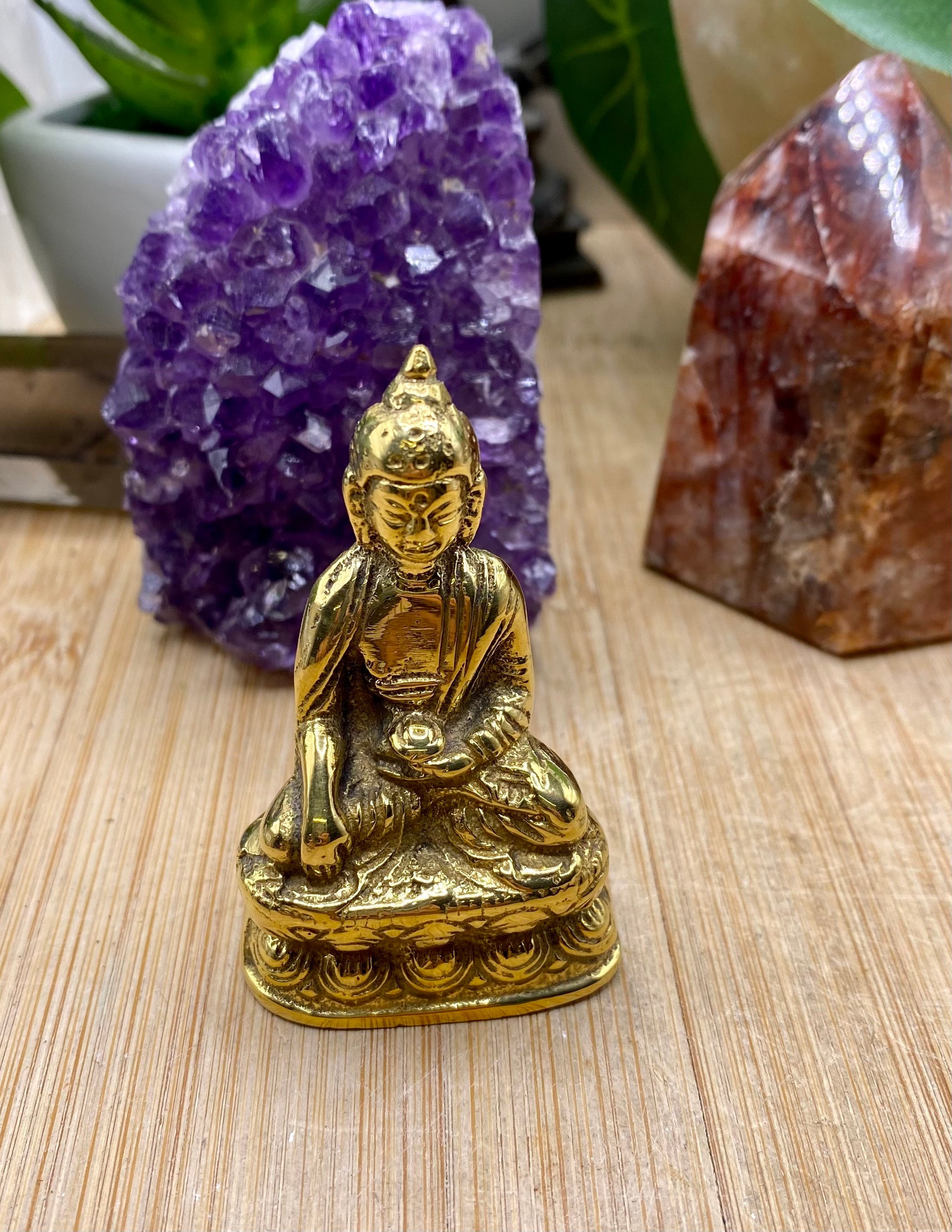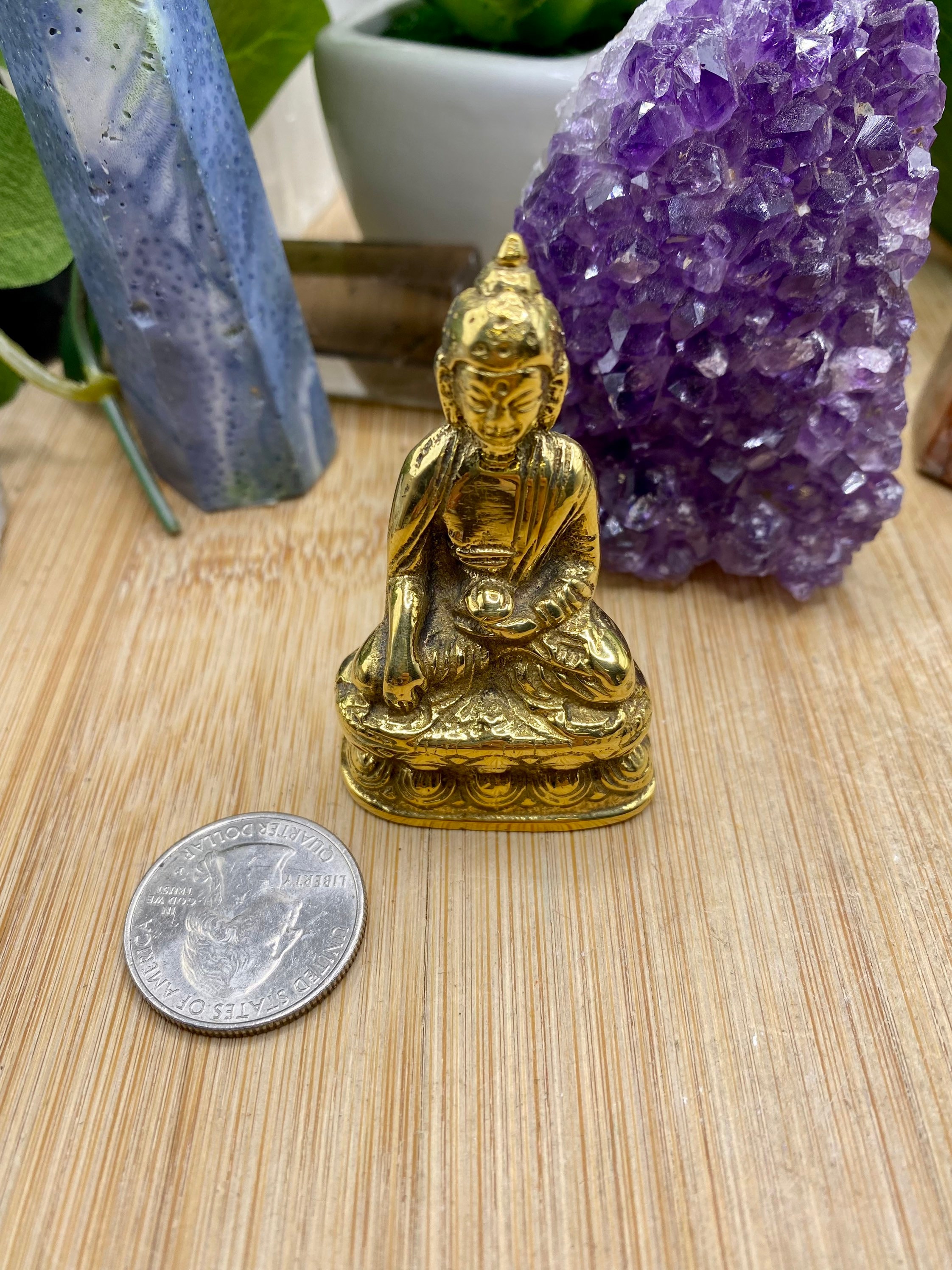 This beautiful Buddha is made of brass. This figurine is 2 inches tall and 1.5 inches long. He has a really healing, calming energy. It would be great for an altar or private sacred space.