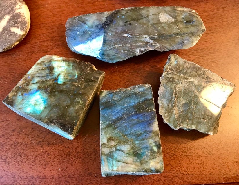 You will receive one Labradorite slab specimen that has absolutely amazing flashes of deep blue and green. The back of the piece has been left unpolished. The piece you will receive will be similar to the the picture above. The small will be approximately 1-1.5 inches. The medium is 1.5-2 inches. The large will be over 2.5 inches. This piece will be similar to the piece shown. You will not receive the piece shown.