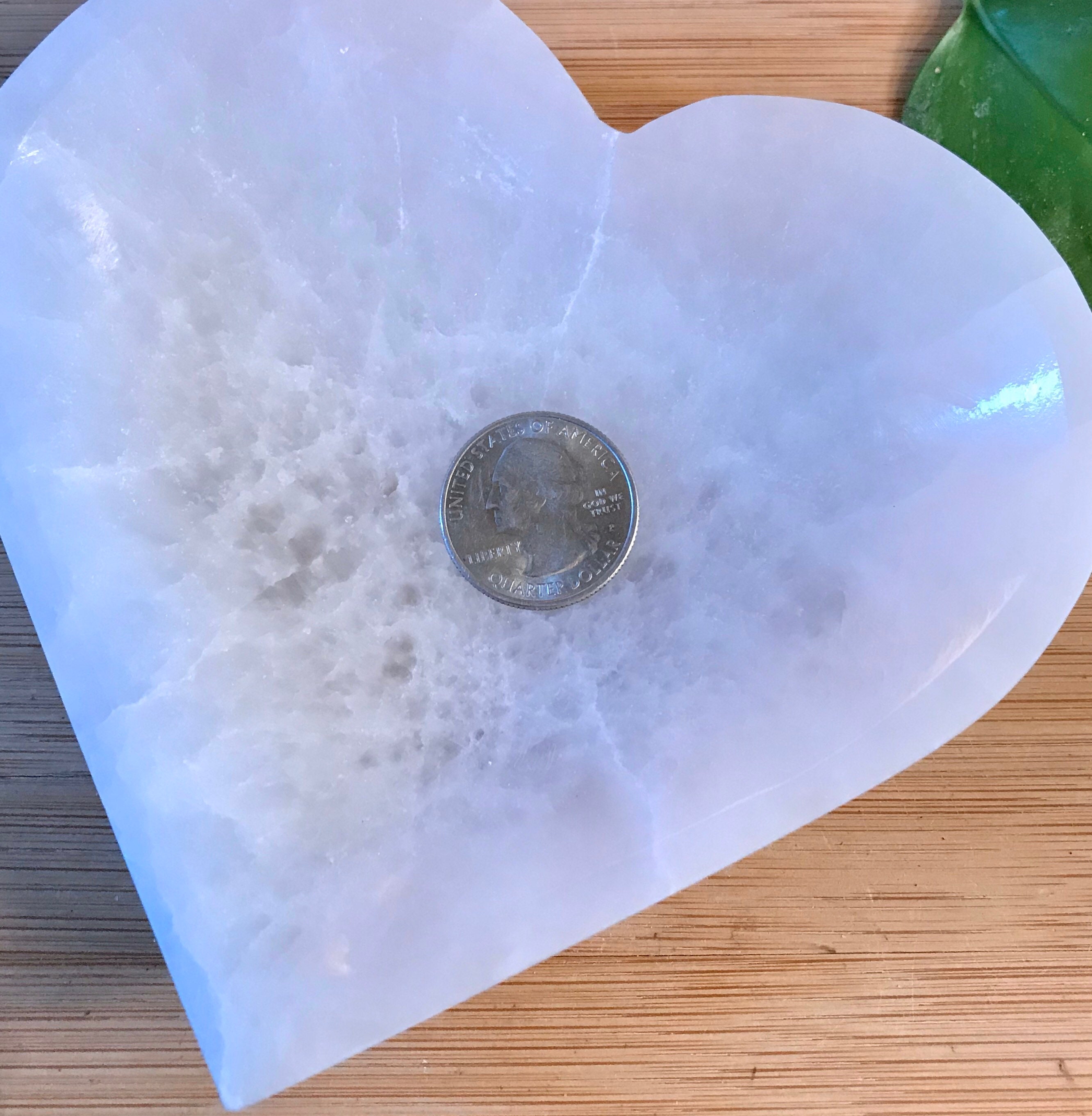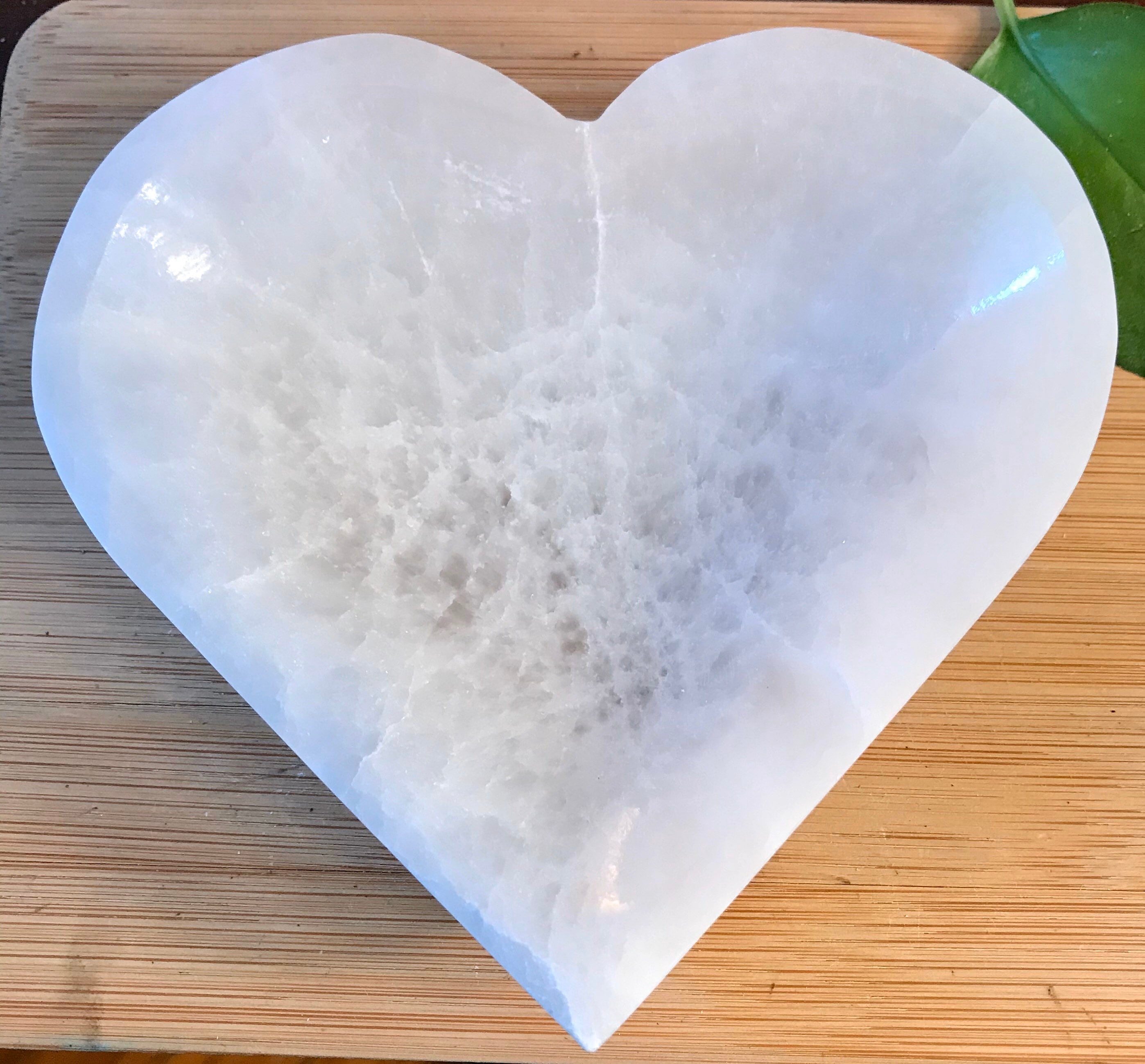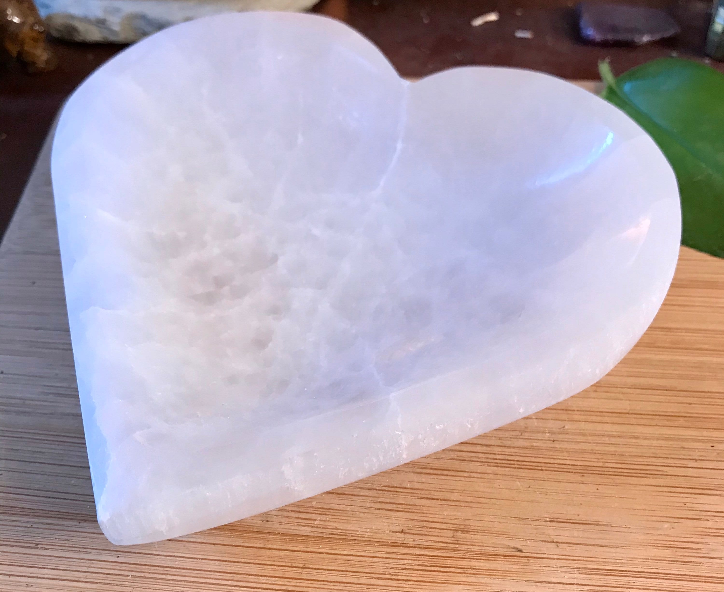 These Polished selenite heart bowls would make make great ritual/offering bowls or altar bowls. They are also great for cleansing crystals or tarot cards. They are approximately 5 inches by approximately 4 Inches in size. These are natural crystal and handcrafted so sizes may vary a little. You will receive a polished selenite bowl similar to the one shown.