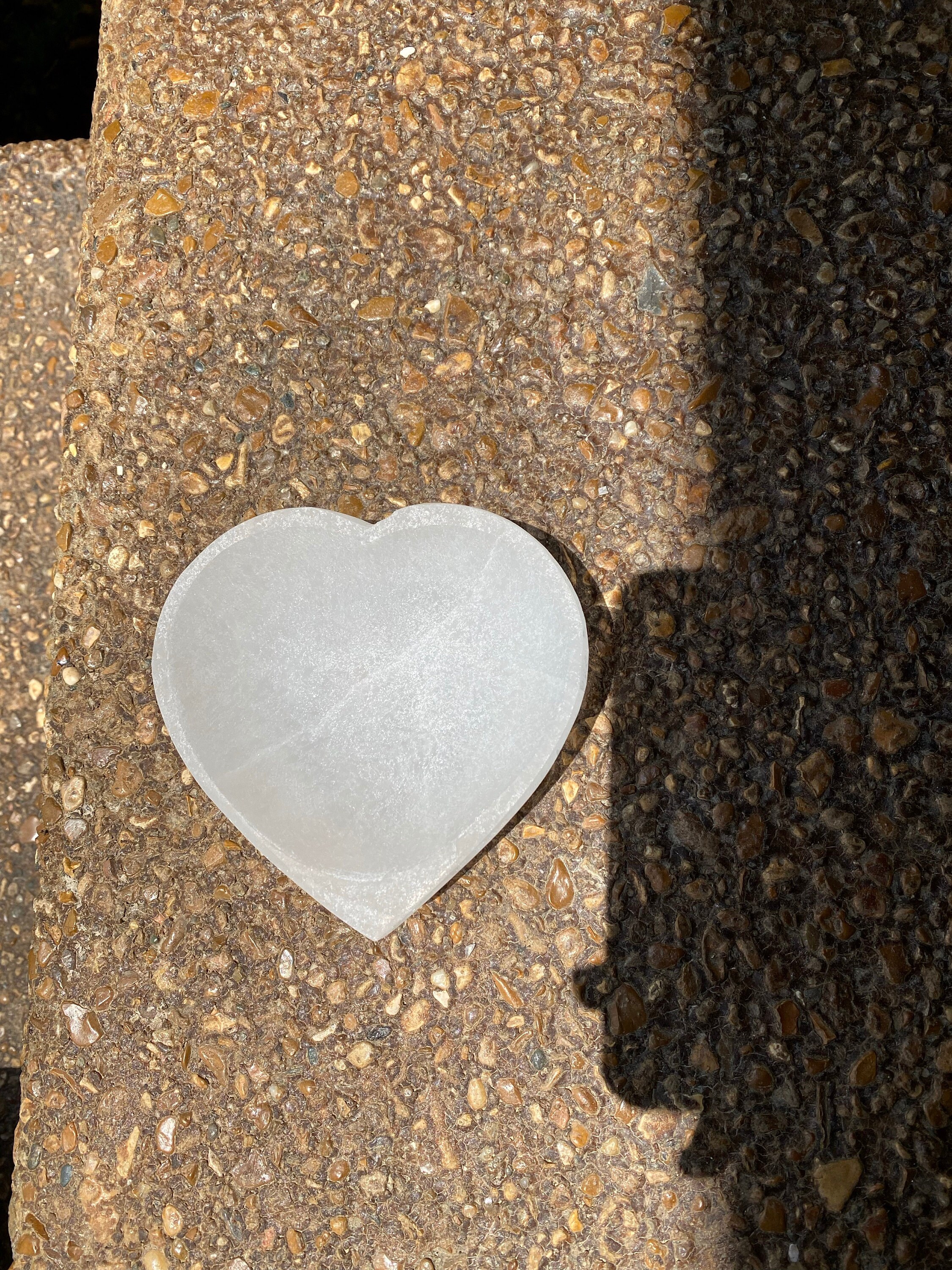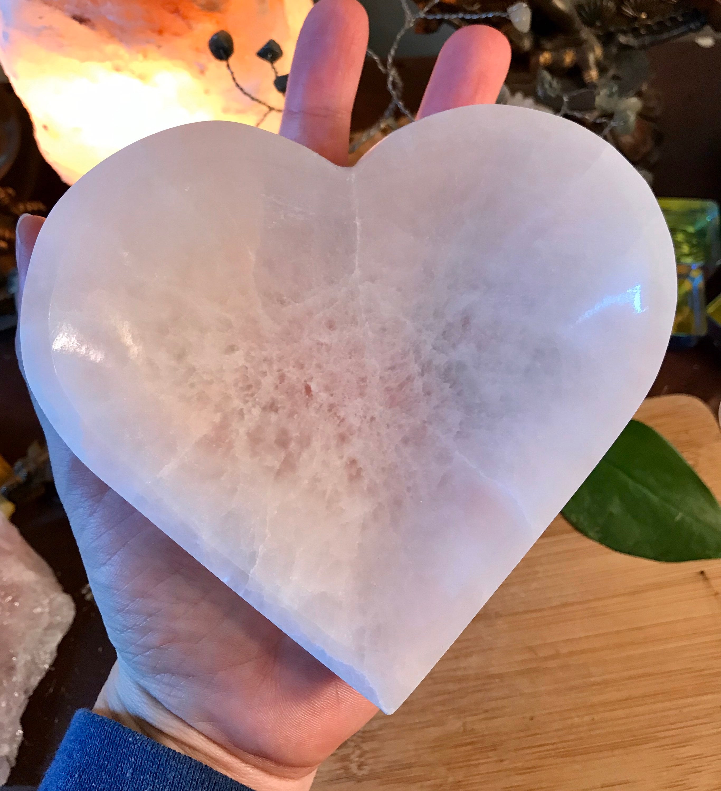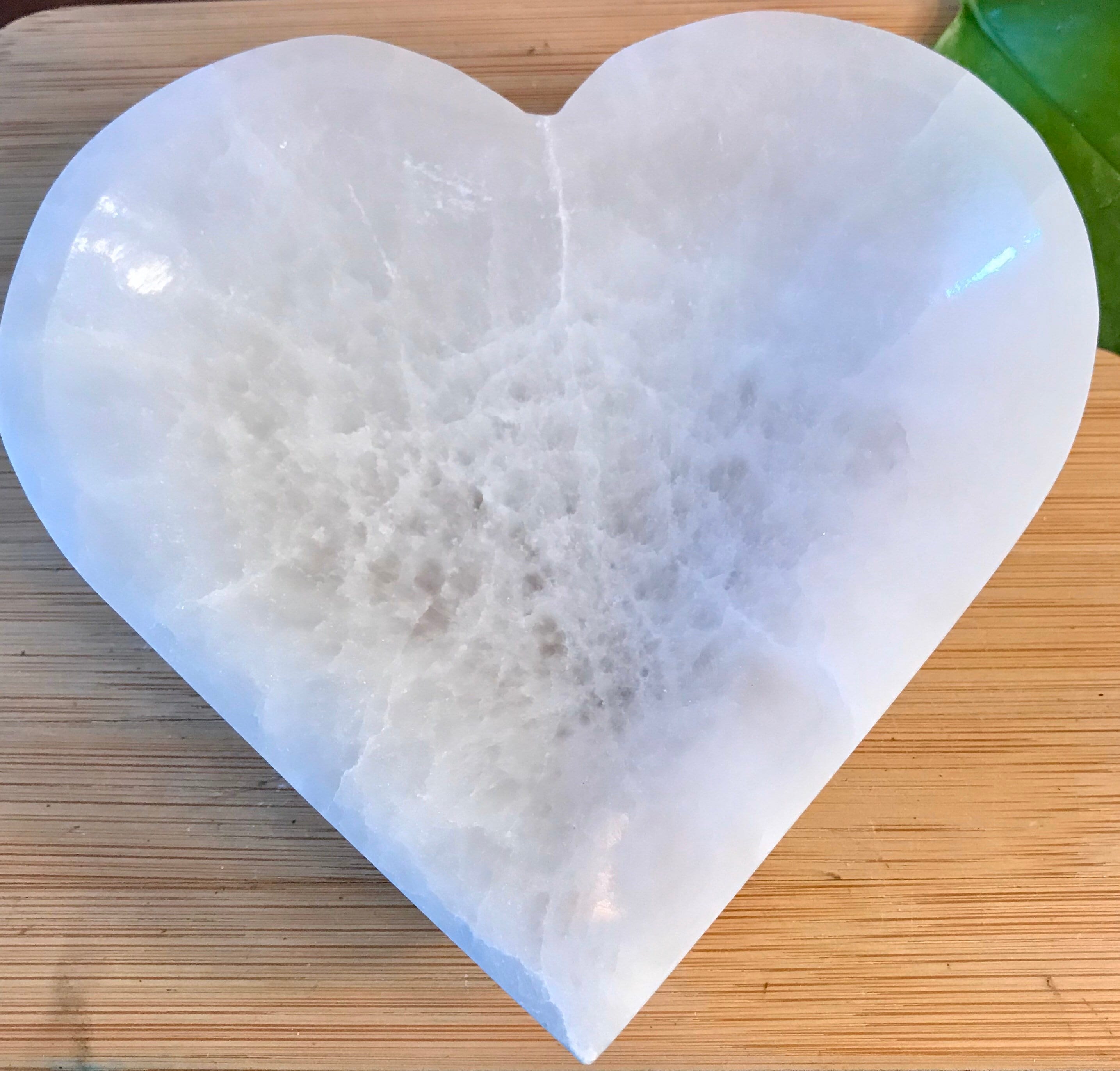 These Polished selenite heart bowls would make make great ritual/offering bowls or altar bowls. They are also great for cleansing crystals or tarot cards. They are approximately 5 inches by approximately 4 Inches in size. These are natural crystal and handcrafted so sizes may vary a little. You will receive a polished selenite bowl similar to the one shown.