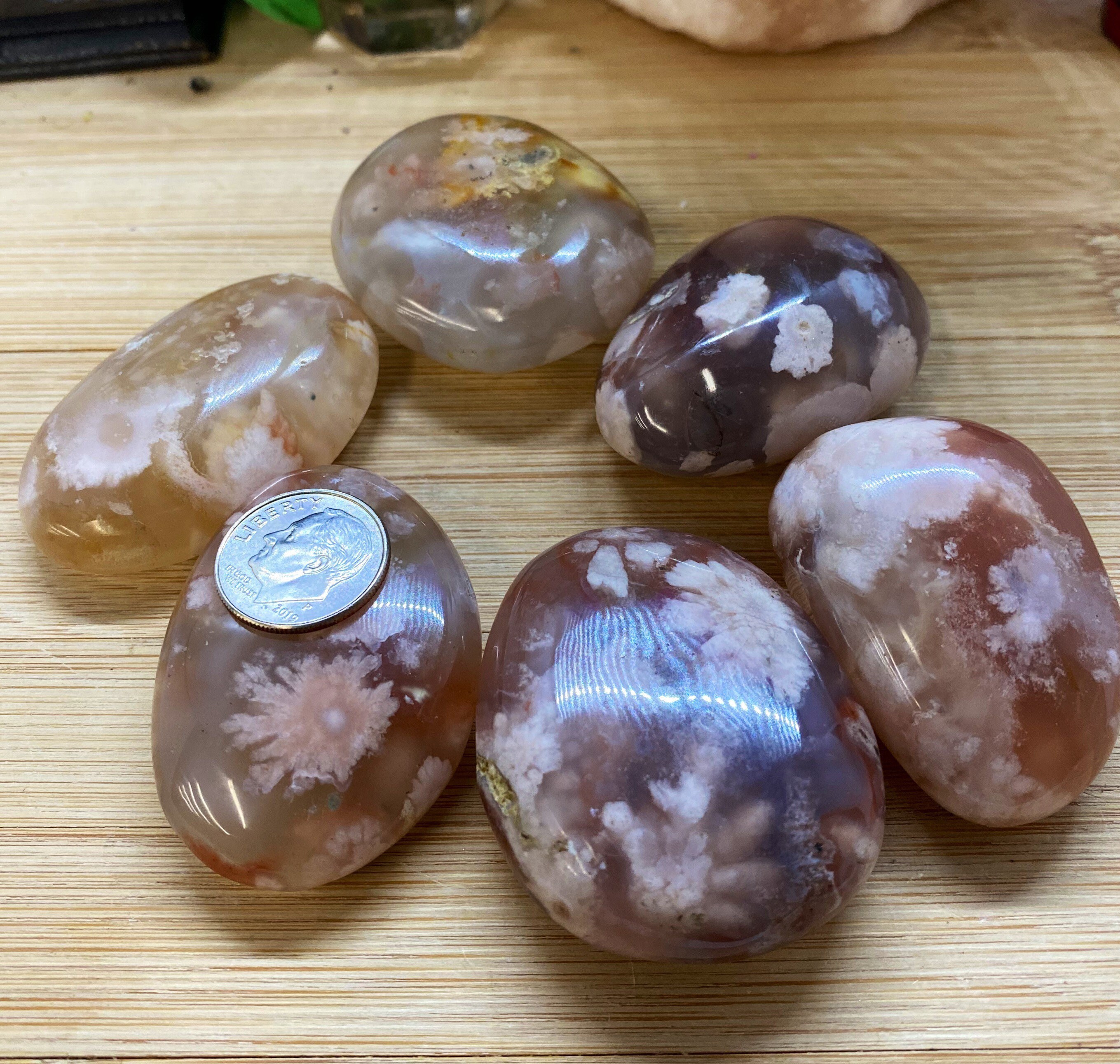 These premium Flower Agate pebbles are really beautiful . These pieces have the most beautiful flowers in them. They remind me of a beautiful piece of art. You will receive one stone similar to the stone pictured. The stones are entirely smooth and fit perfectly in hand. They measure approximately 1 inch to 1.5 inches in size.