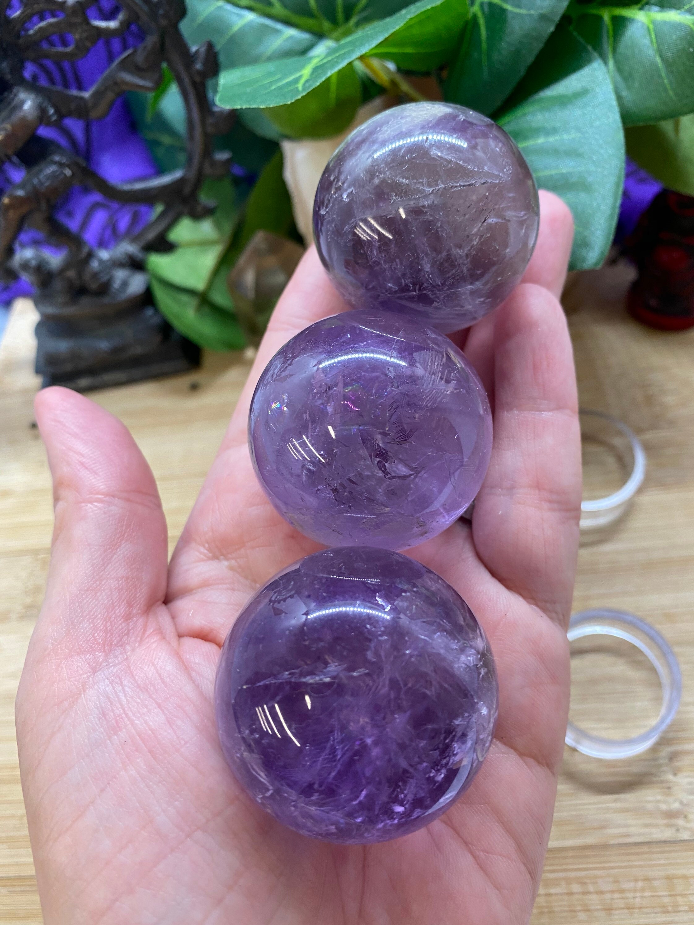 These gorgeous Amethyst spheres are 40mm in diameter and have an amazing bright purple color that shimmers with rainbow inclusions. These are great spheres for meditation and/or display. You will receive a sphere like the one in the photograph. You may not receive the exact sphere in the photograph. All spheres will include a free sphere stand!