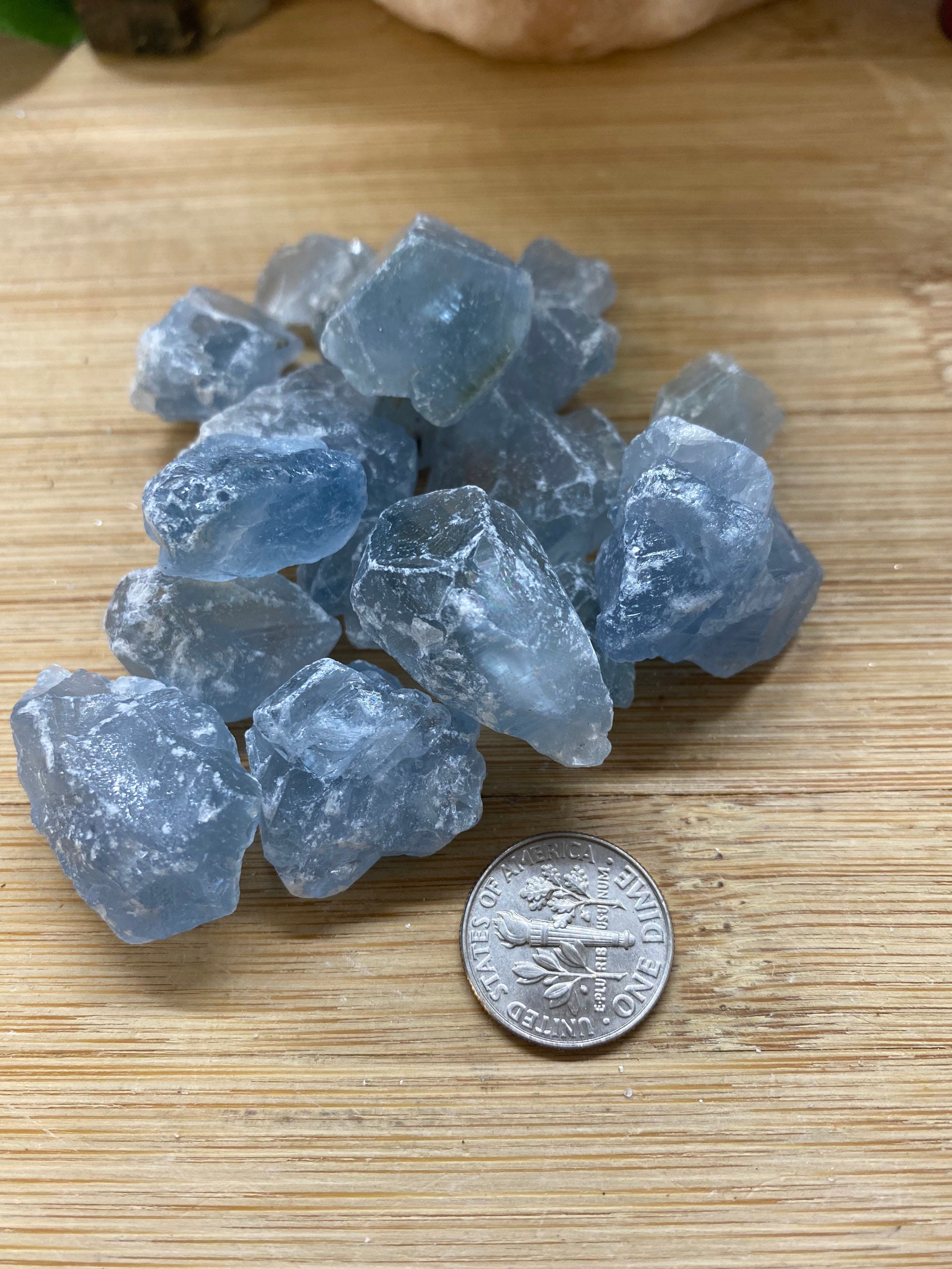 I ordered the 4oz Lot of raw, natural Celestite which yielded 19 pieces, ranging in size from 7/8” x 5/8” x 3/8” down to 5/8” x 3/8” x 1/4”. The stones aren’t as vivid blue as those in the listing photo but are definitely that signature Celestite Blue. These are very clean stones without any blemishes. Very nice.