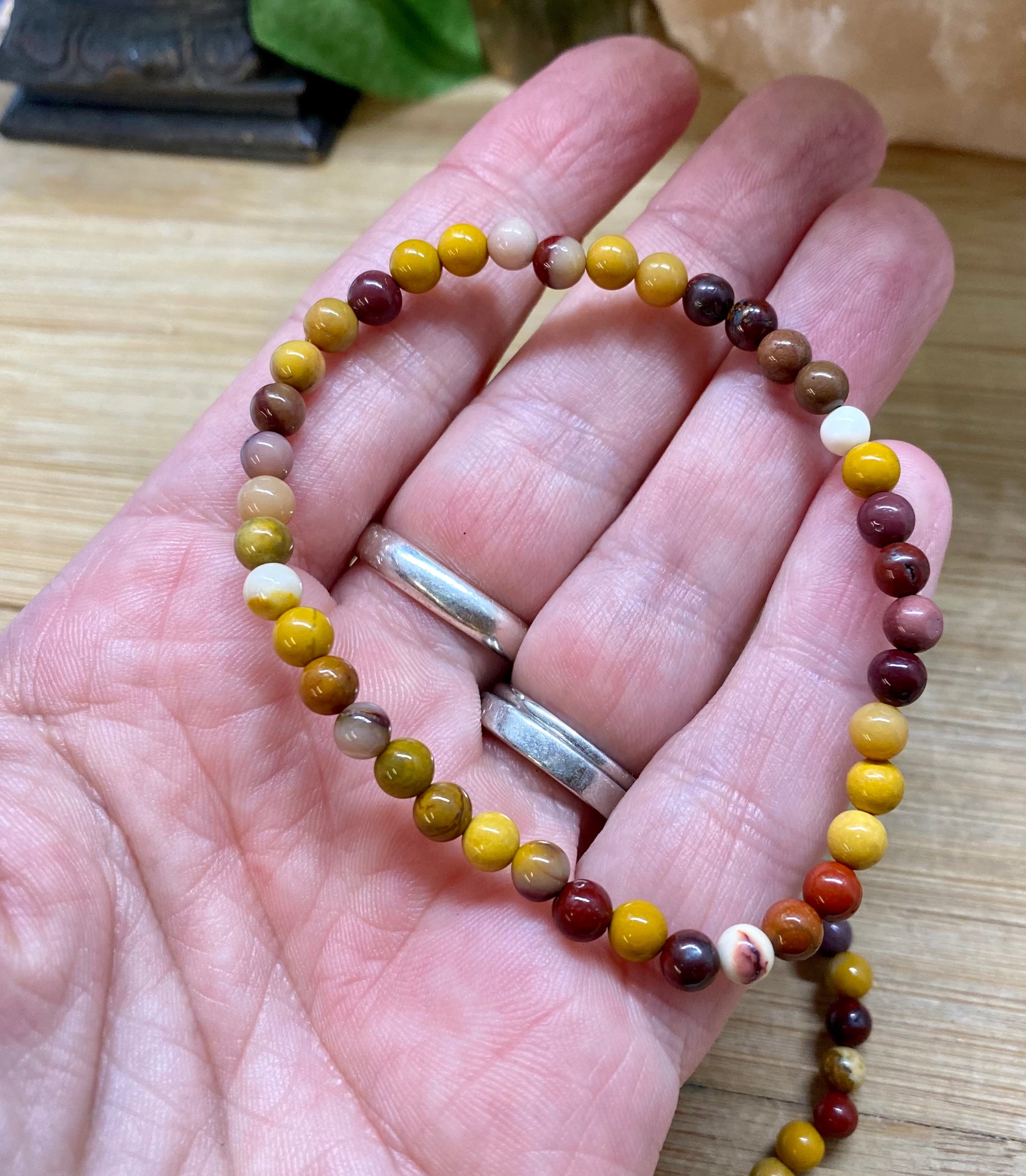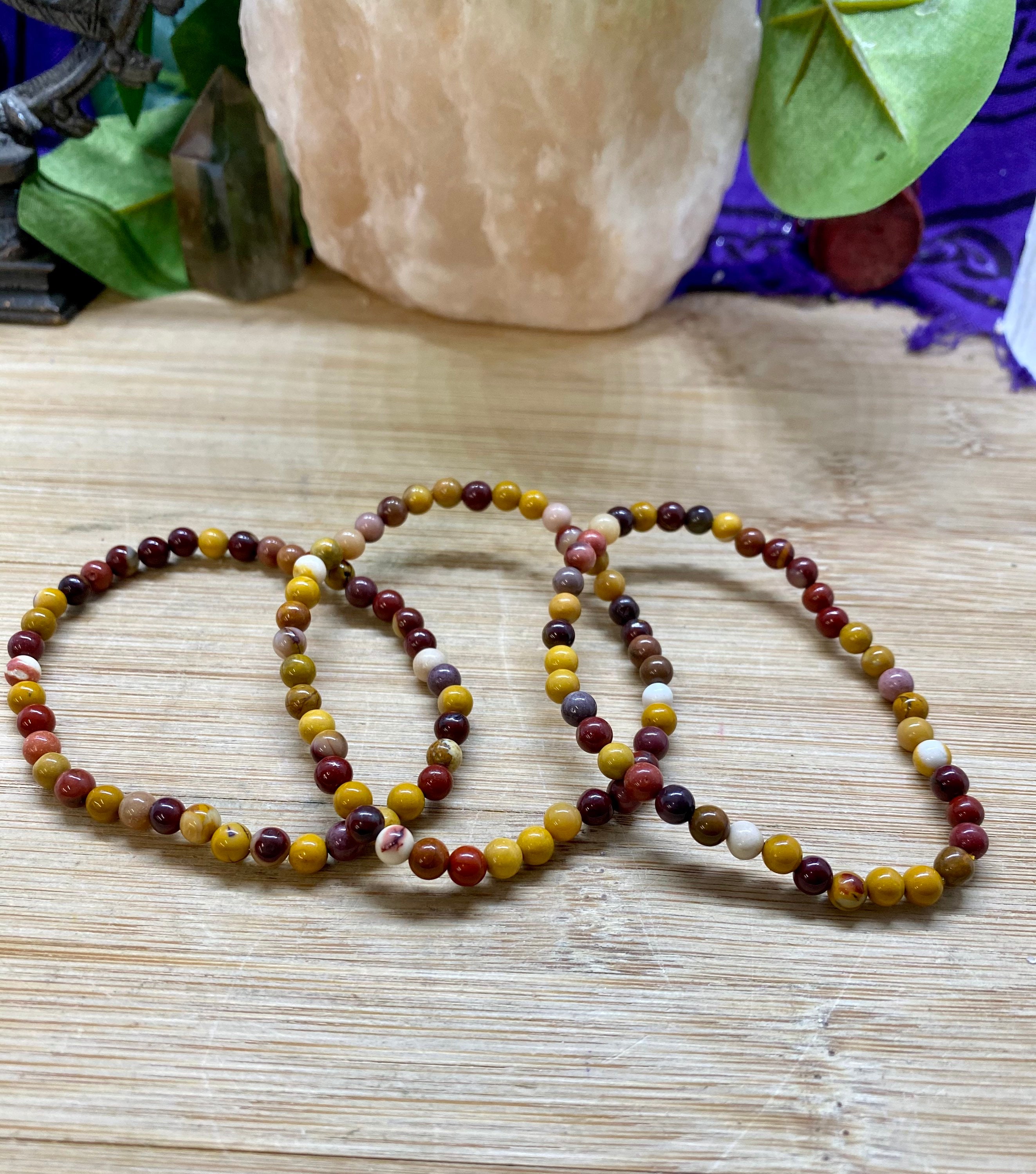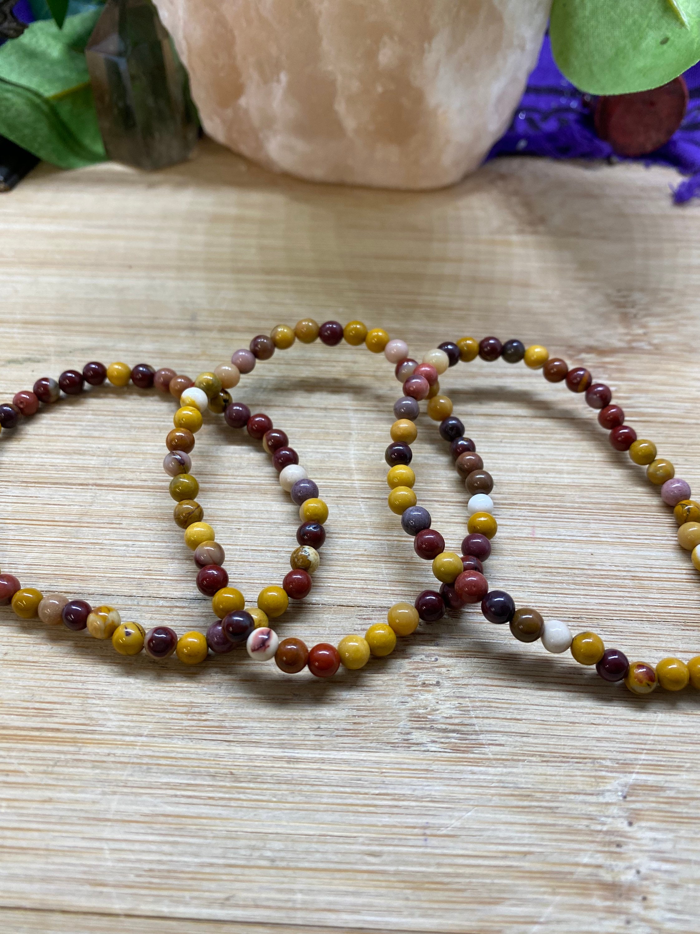 This beautiful bead bracelet is made of Mookaite. The beads are 4mm. The bracelet is elastic and fits most wrists.