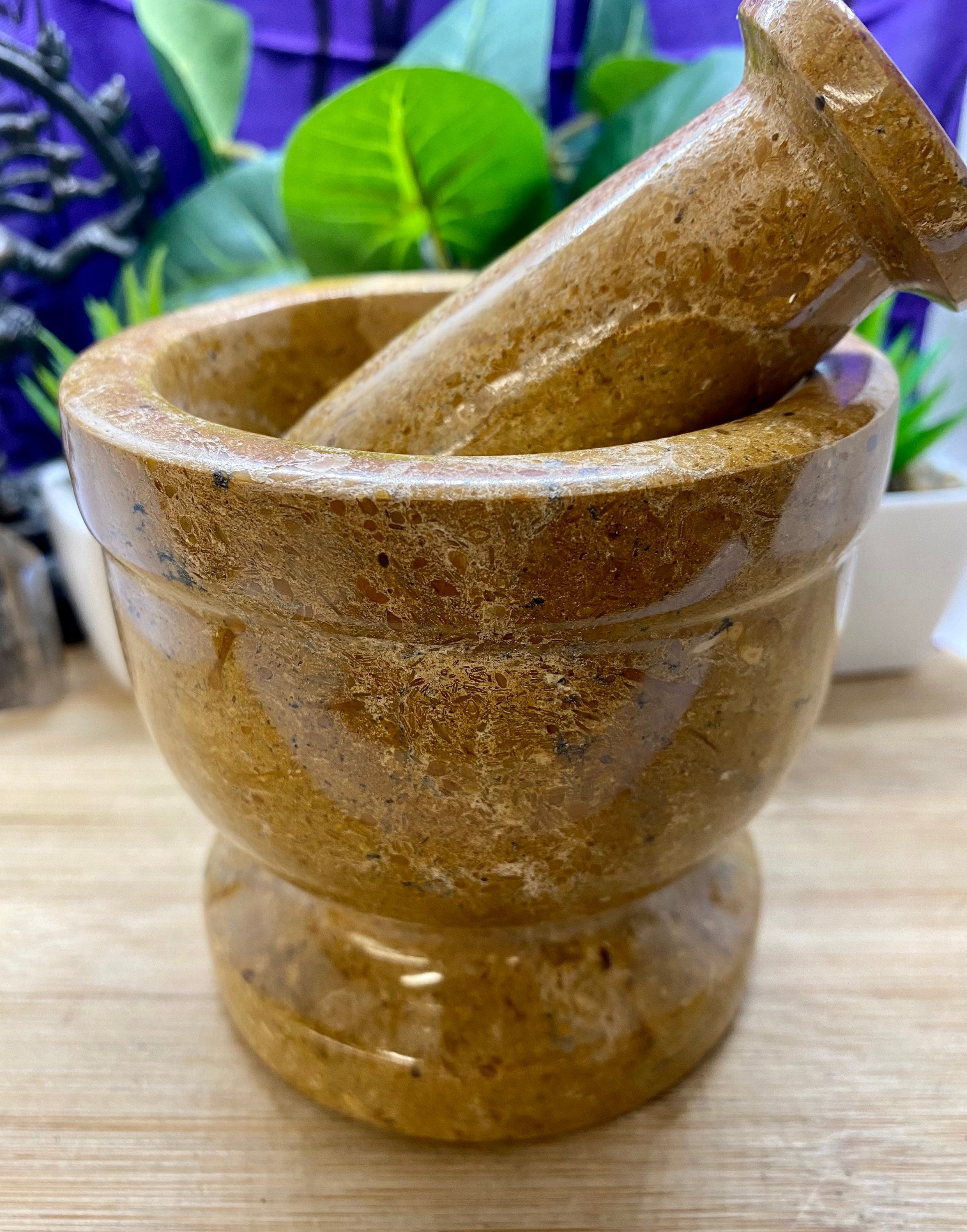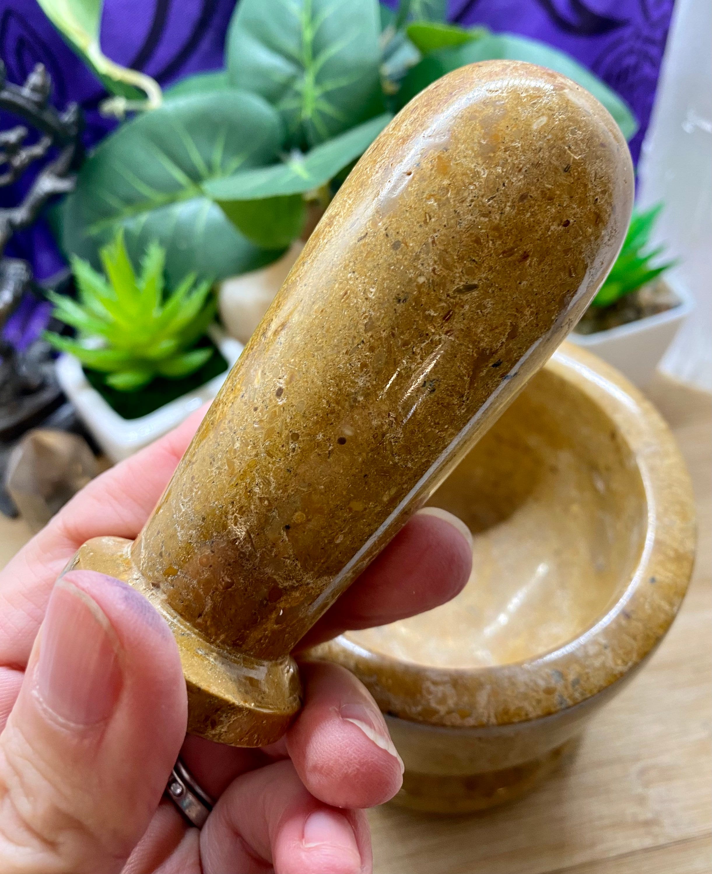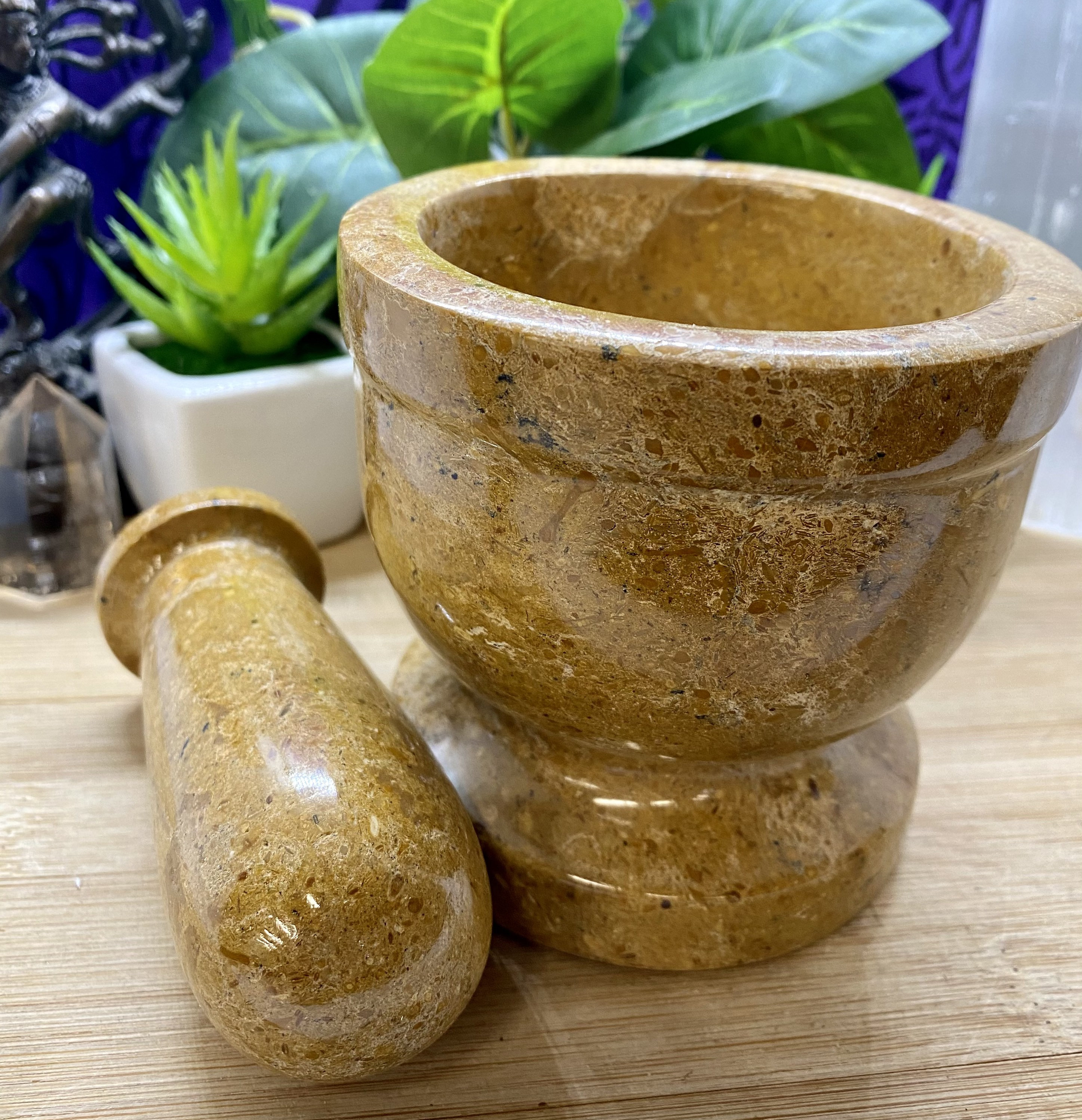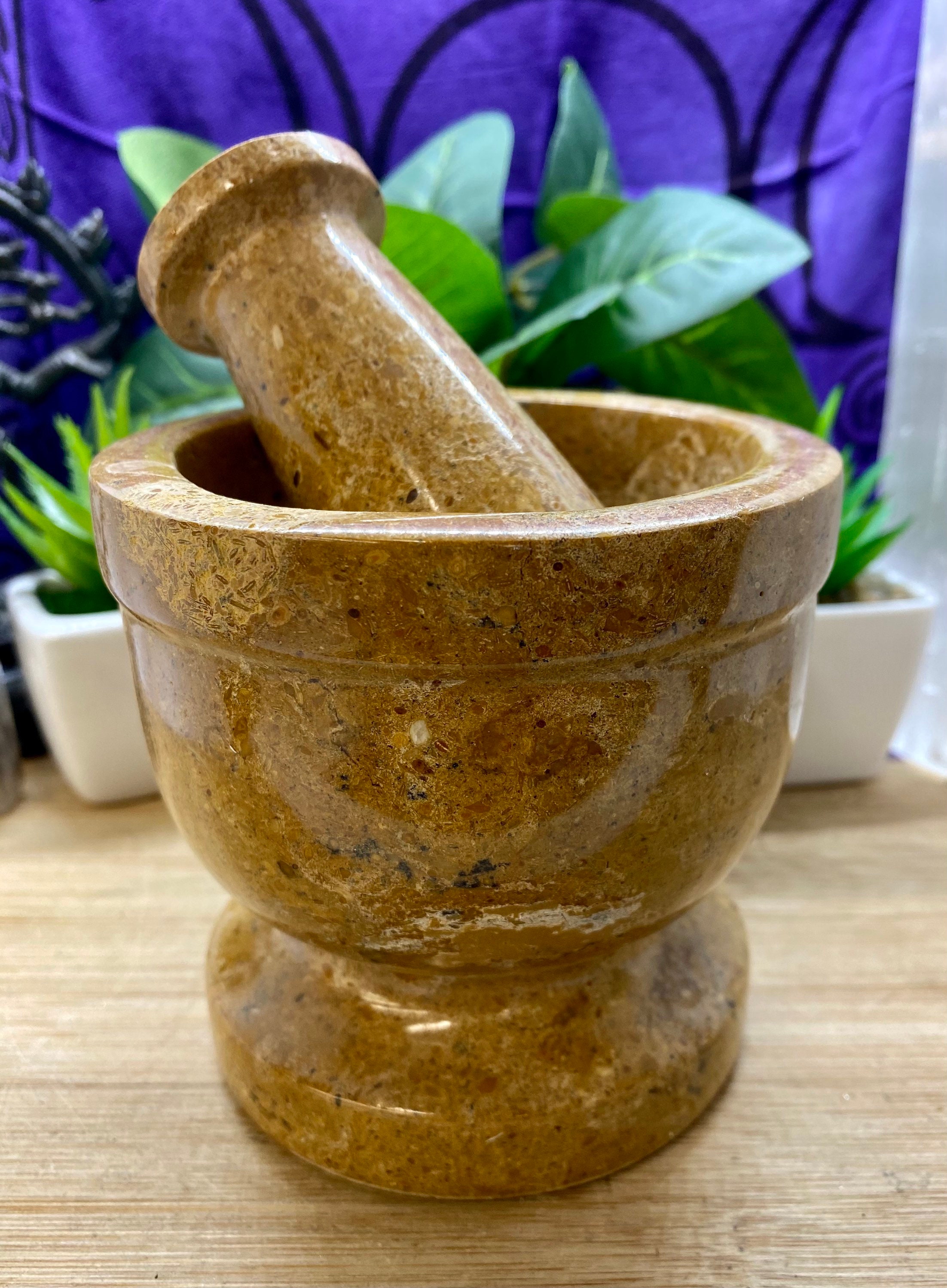 This Golden marble mortar and pestle set is gorgeous!!. It would be awesome for grinding herbs. This is a natural stone product. There may be variation in colors. It is 3.5” round, 3.5” high