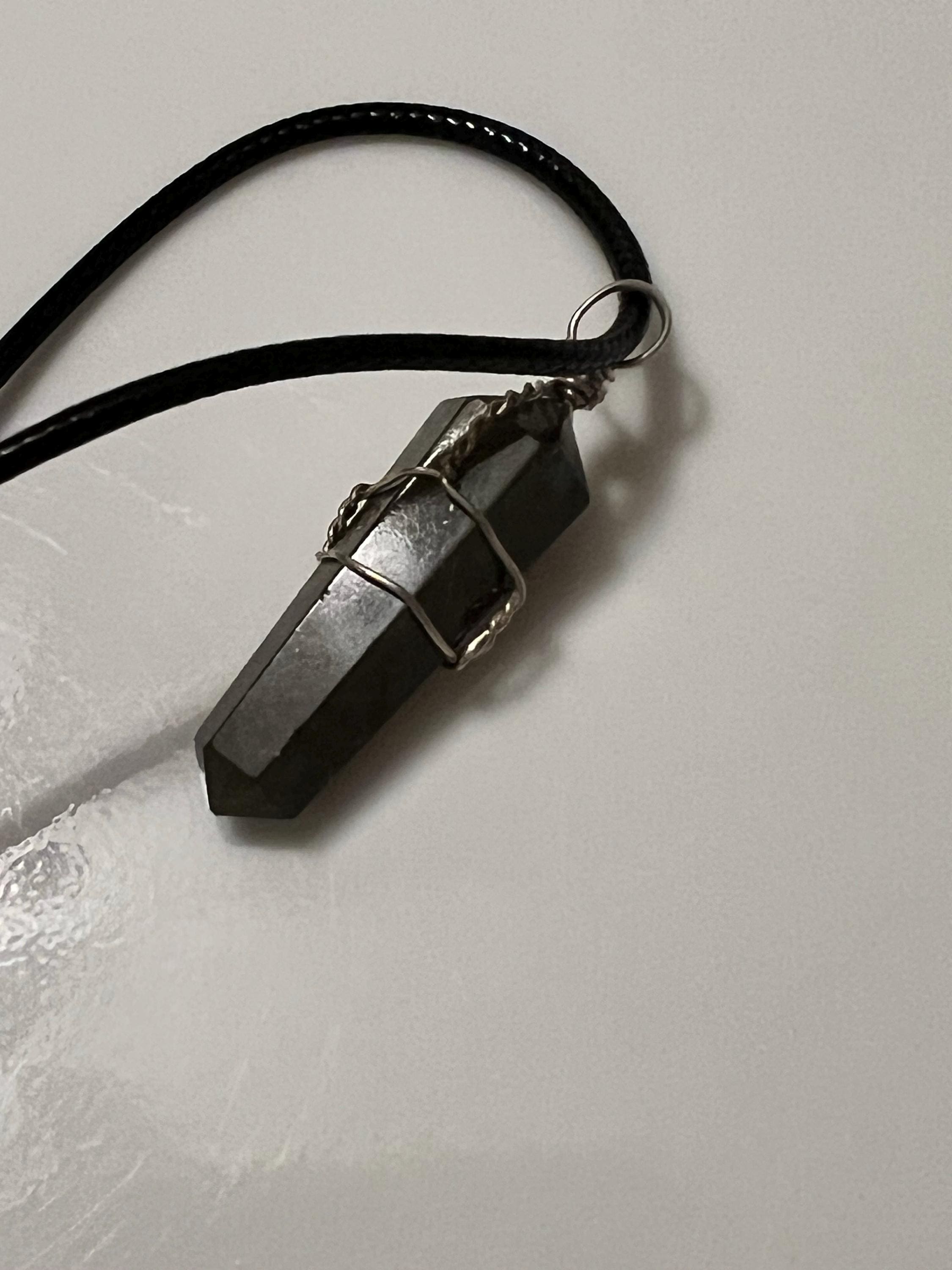 The labradorite pendant is approximately 1 inch long. It is a double terminated point wrapped in silver wire. Chain not included.